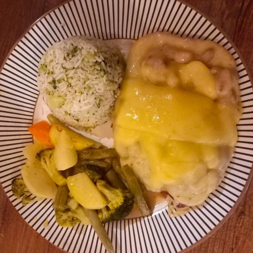 Parmegiana pra Quem como pouco Filé de Frango com Queijo mussarela derretido e Saborosíssimo de Molho de tomate de sabor equilibrado. Acompanha Arroz Branco soltinho e Batatas Fritas crocantes . #tags: tipica - italiana - cozinha - culinária - almoço Serve 1 pessoa