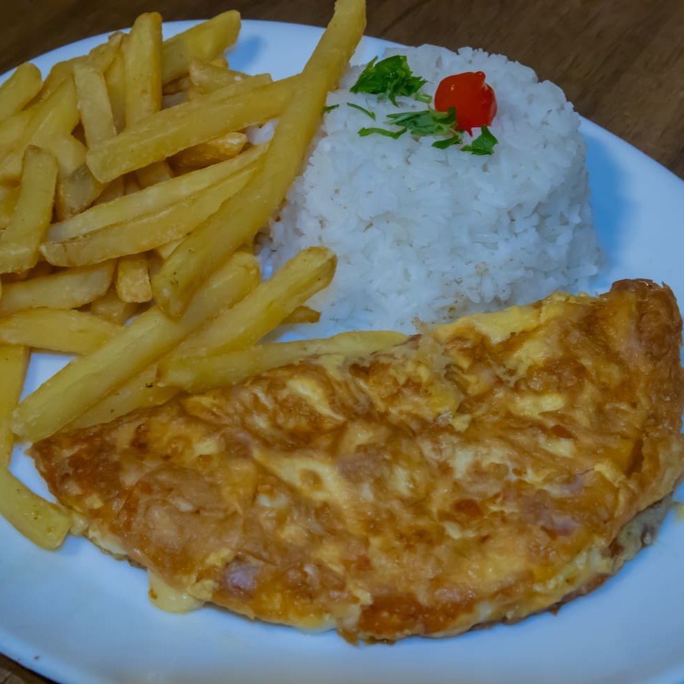 Omelete recheada com Queijo mussarela e presunto + Arroz branco + Feijão em caldo + Batata frita *Favor informar na observação se irá necessitar de talheres descartáveis! **Para este item não é possível a troca de componentes #tags: bbb - brasileiro - bom - barato Serve 1 pessoa
