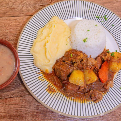 Picadinho de Carne + Arroz branco + feijão em caldo + Batata frita *Favor informar na observação se irá necessitar de talheres descartáveis! **Para este item não é possível a troca de componentes #tags: bbb - brasileiro - bom - barato Serve 1 pessoa