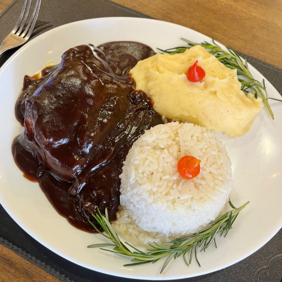 Costelinha de Porco desmanchando no osso, ao Molho Barbecue. Acompanha Arroz Branco e Purê de Batatas Serve 1 pessoa