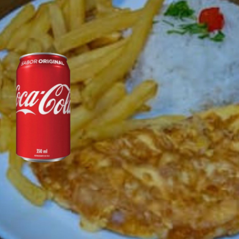 Omelete recheada com Queijo mussarela e presunto + Arroz branco + Feijão em caldo + Batata frita 1 Coca - cola lata 350ml *Favor informar na observação se irá necessitar de talheres descartáveis! **Para este item não é possível a troca de componentes ***Imagem ilustrativa Serve 1 pessoa