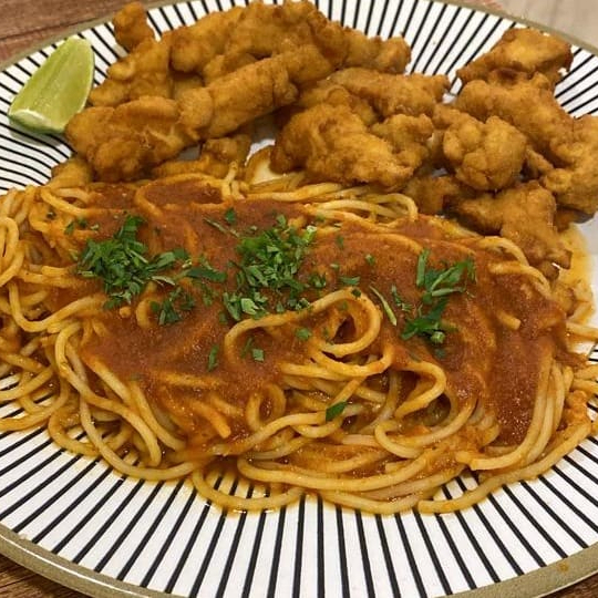 Iscas de Filé de Frango empanadinhas e bem sequinhas acompanhadas de Espaguete ao Molho Sugo ( Molho de Tomate bem encorpado ) Porção Hits ( baby ) #tags: almoço - janta - bom - barato - refeição - prato feito - marmita - tio bar & restaurante Serve 1 pessoa