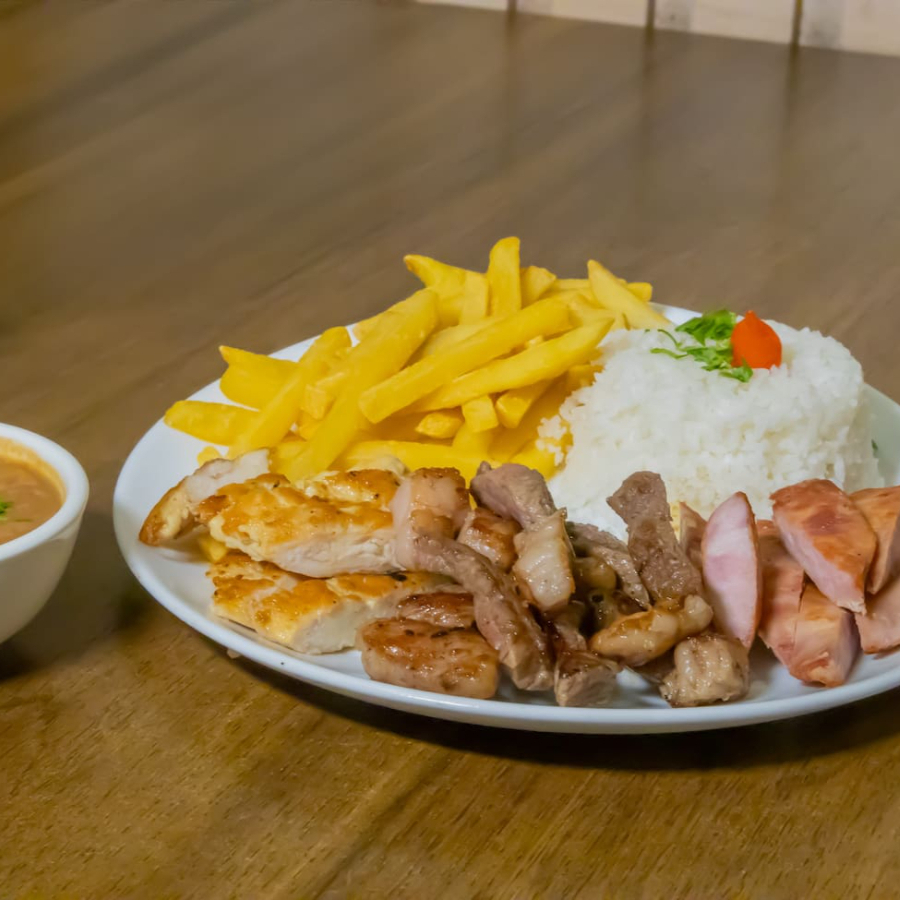 Executivo de Grelhados Misto (Carne de boi, Frango e Linguiça Toscana), acompanhados de Arroz branco soltinho, Feijão delicioso e Batata frita crocante #tags: almoço - quentinha - marmita - prato - feito Serve 1 pessoa