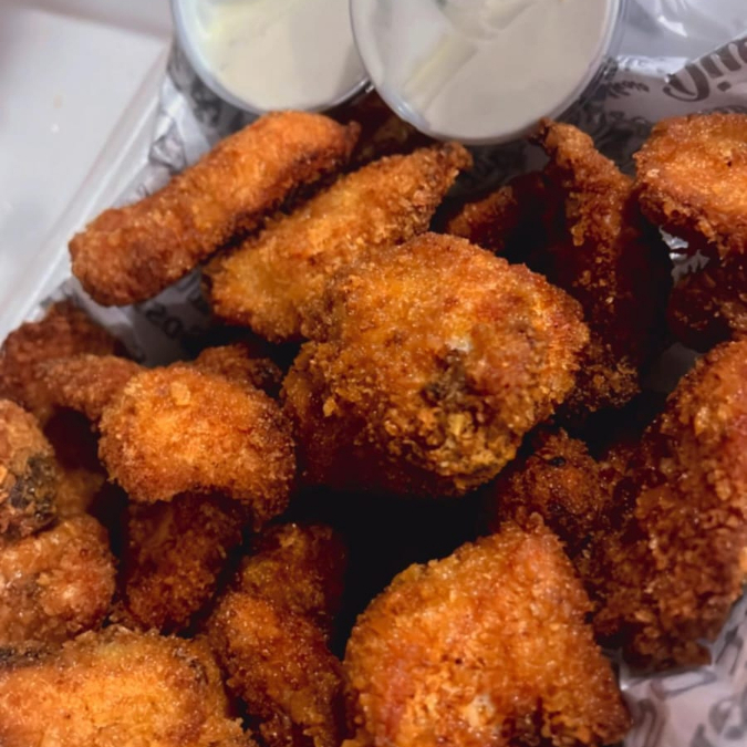 20 PEDAÇO DE FRANGO A PASSARINHO EMPANADO, ACOMPALHA MOLHO DE ALHO