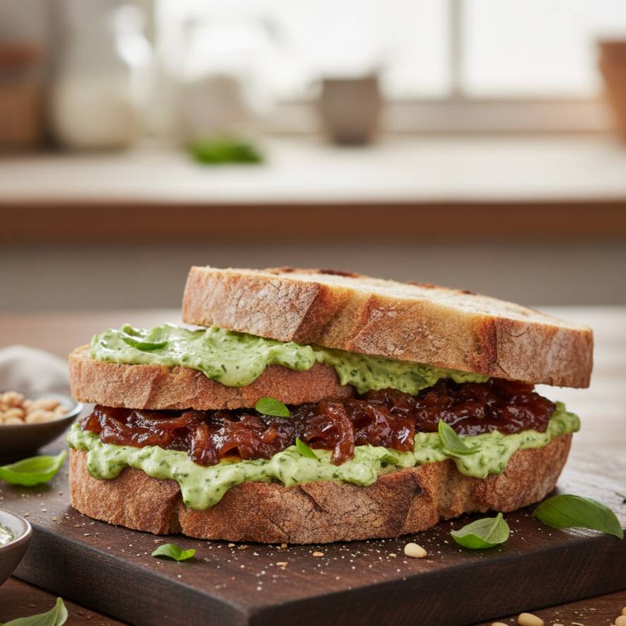 Pão ciabatta, queijo de castanha artesanal, fatias de tomate e patê de girassol