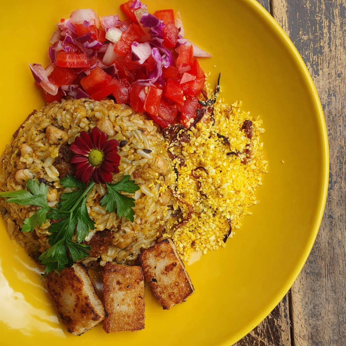 Nhoque de batata e mandioquinha refogado no alho-poró, cebola roxa e azeite, feito com molho orgânico da casa(mix de tomate cereja e tomate italiano) ao sugo, finalizado com alecrim, manjericão fresco e queijo ralado de amendoim. Acompanha salada de orgânicos.