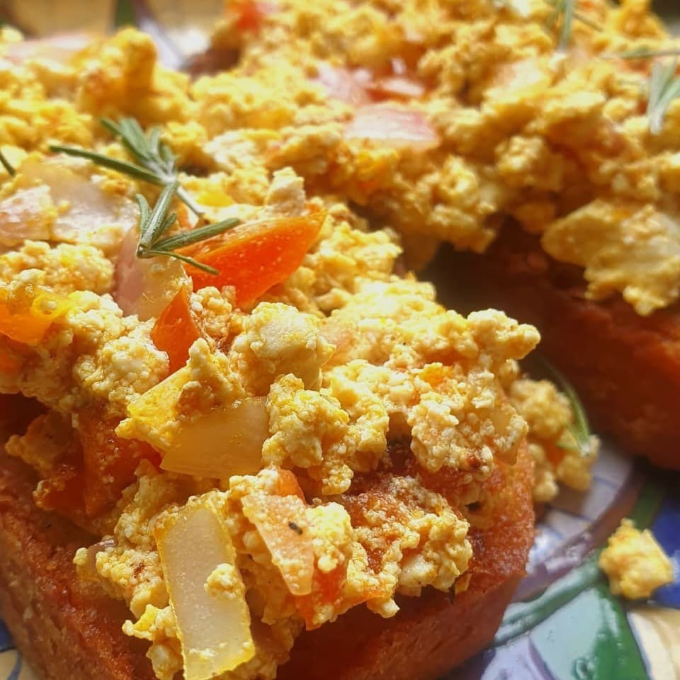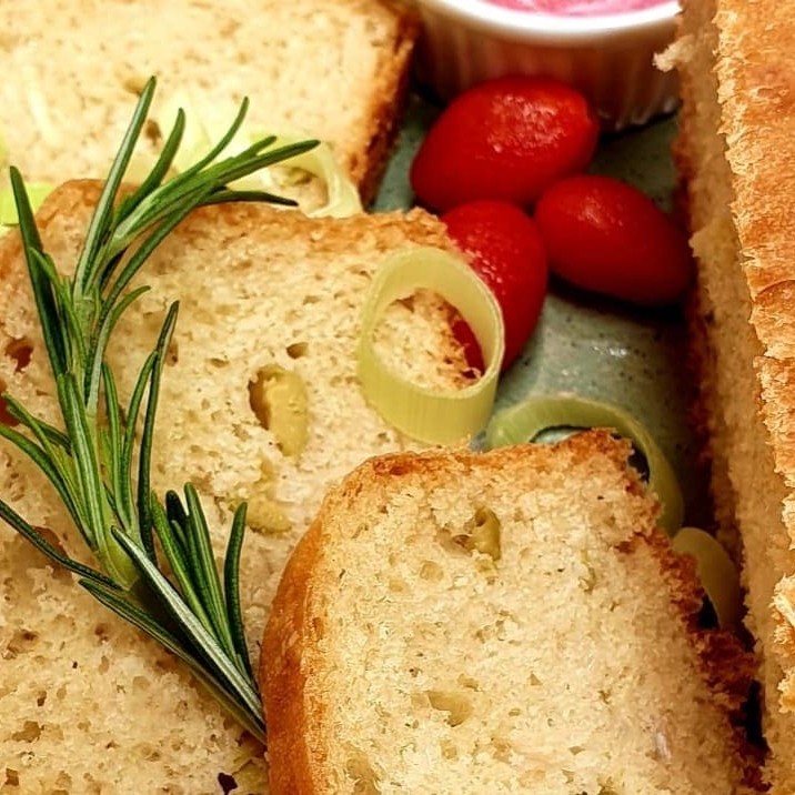 Pão artesanal na chapa com nosso queijo de castanha da casa gratinado e tomate cereja