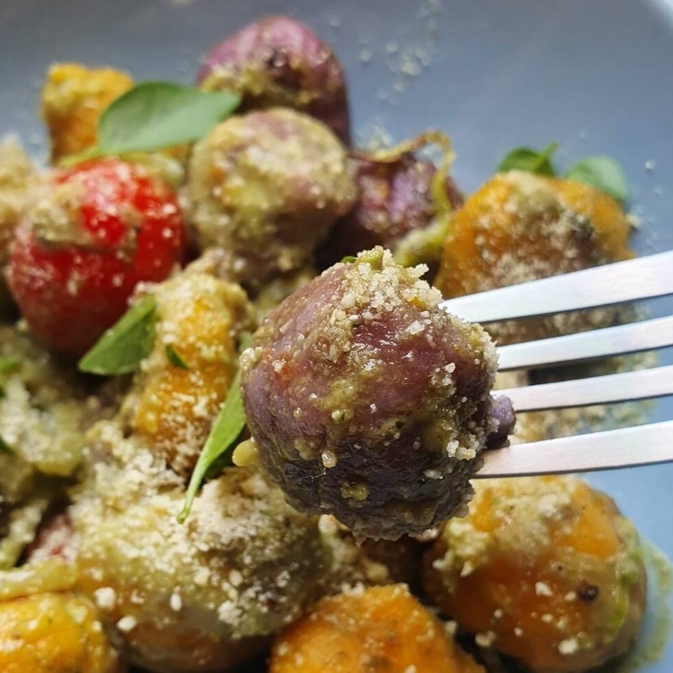 Nhoque de batata e mandioquinha refogado no alho-poró, cebola roxa e azeite, feito com molho orgânico da casa(mix de tomate cereja e tomate italiano) ao sugo, finalizado com alecrim, manjericão fresco e queijo ralado de amendoim. Acompanha salada de orgânicos.