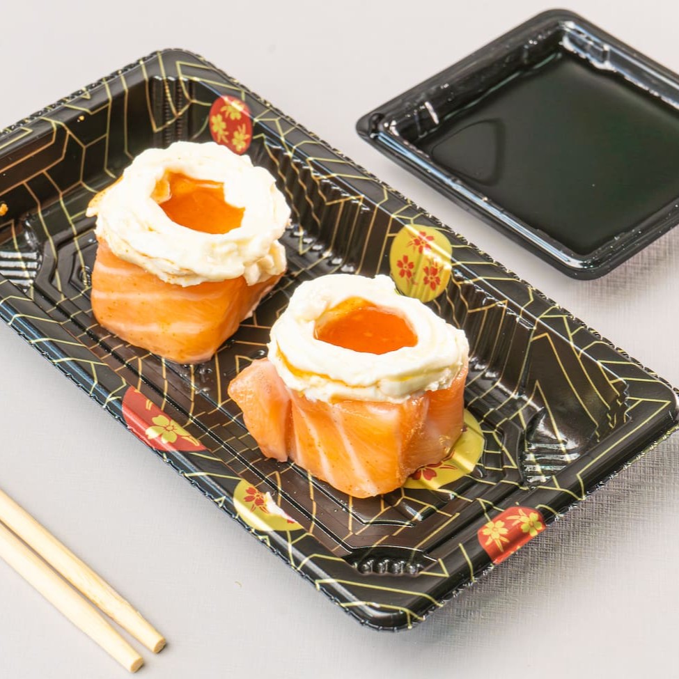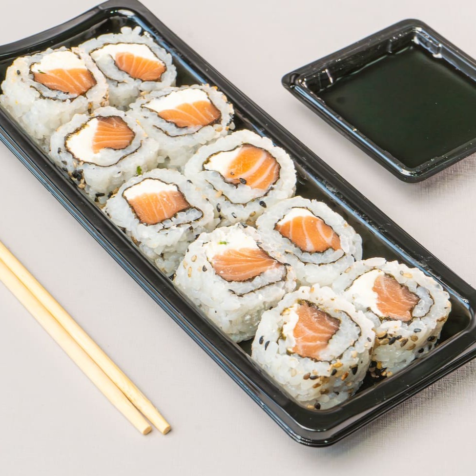 Conhecido como sushi invertido, ele traz o gohan (arroz japonês) por fora e a alga por dentro, juntamente com salmão cru e cream cheese. (10 unidades)