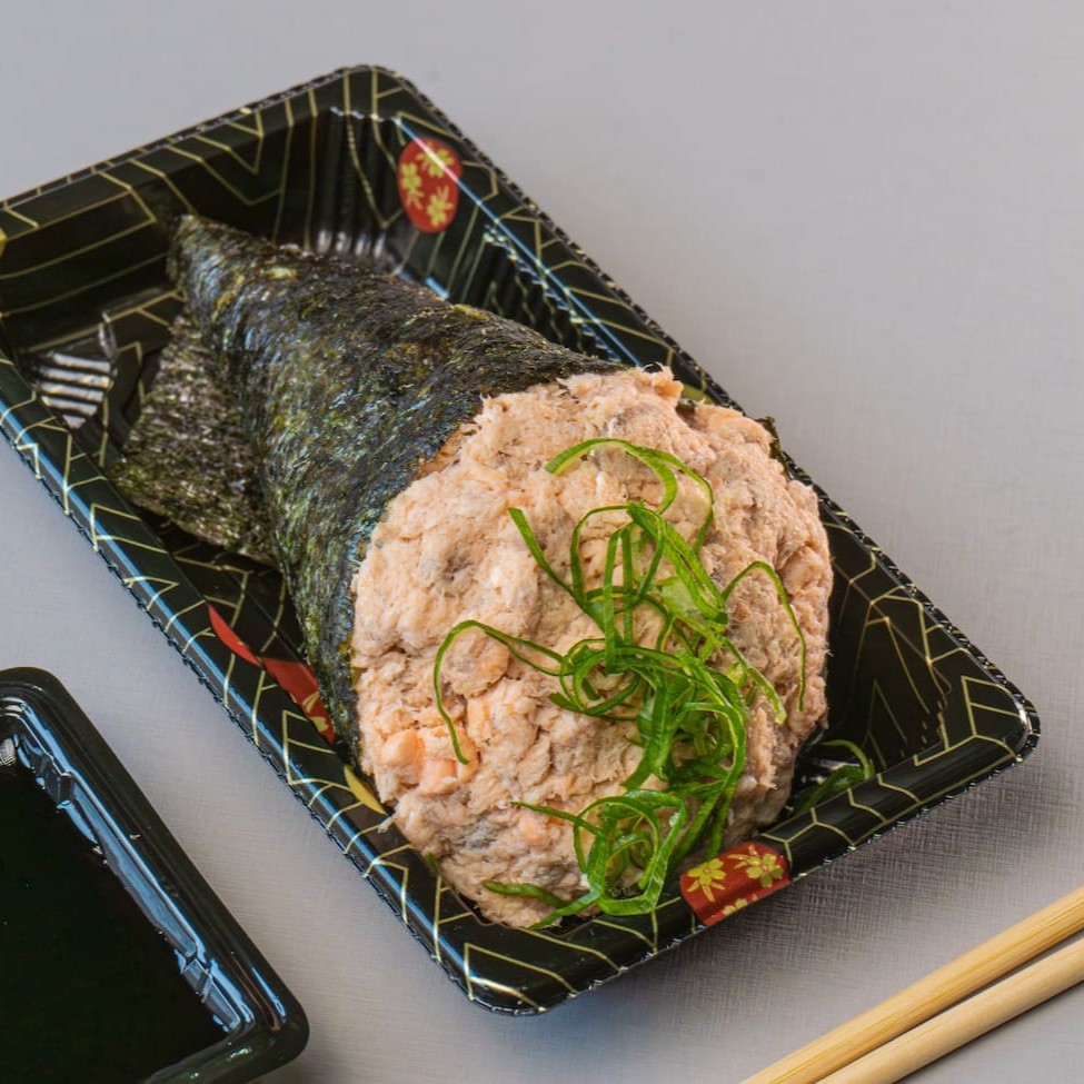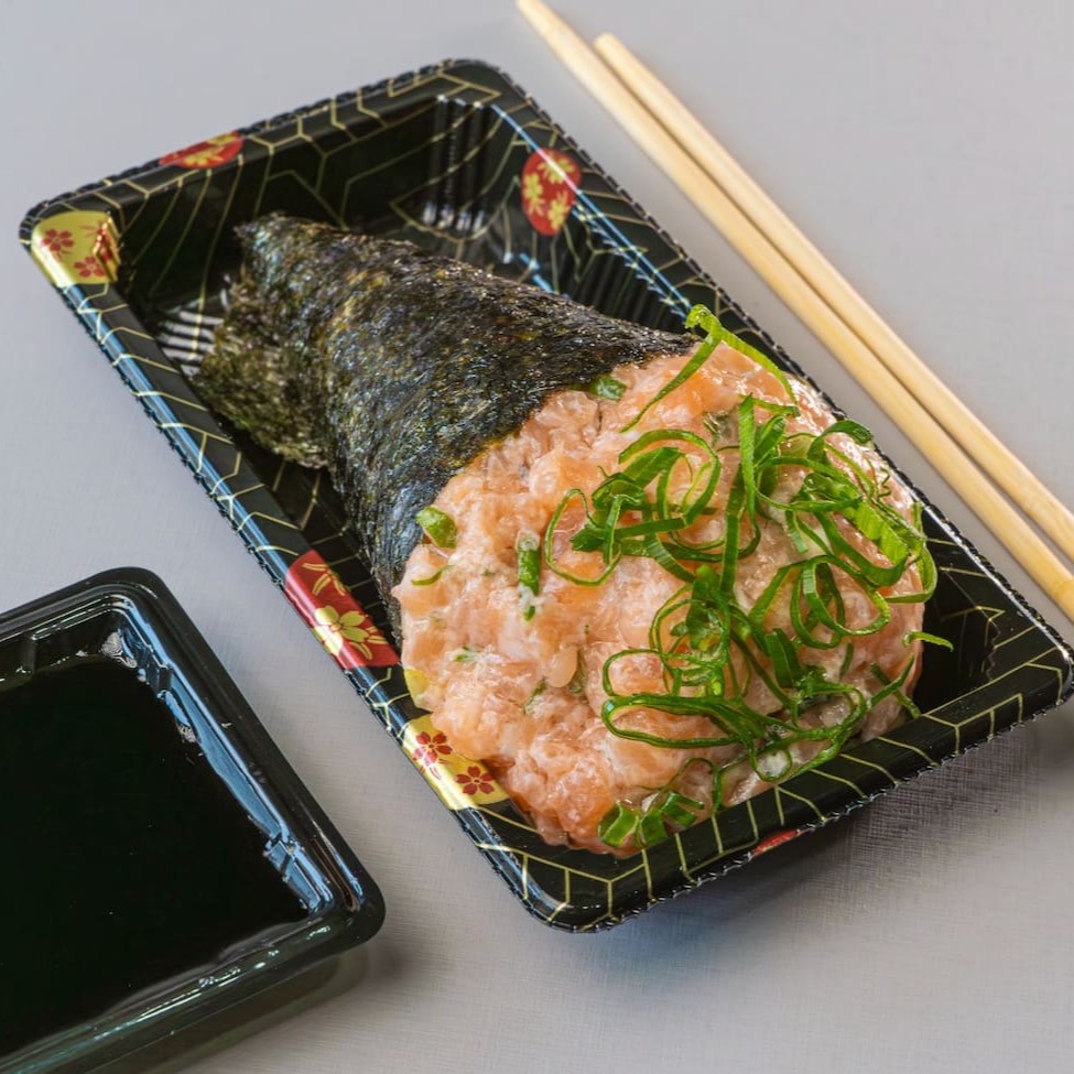 Temaki recheado com salmão (cru ou grelhado) , arroz japonês, cream cheese , cebolinha e um toque especial de gengibre.