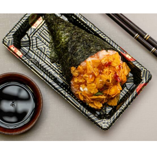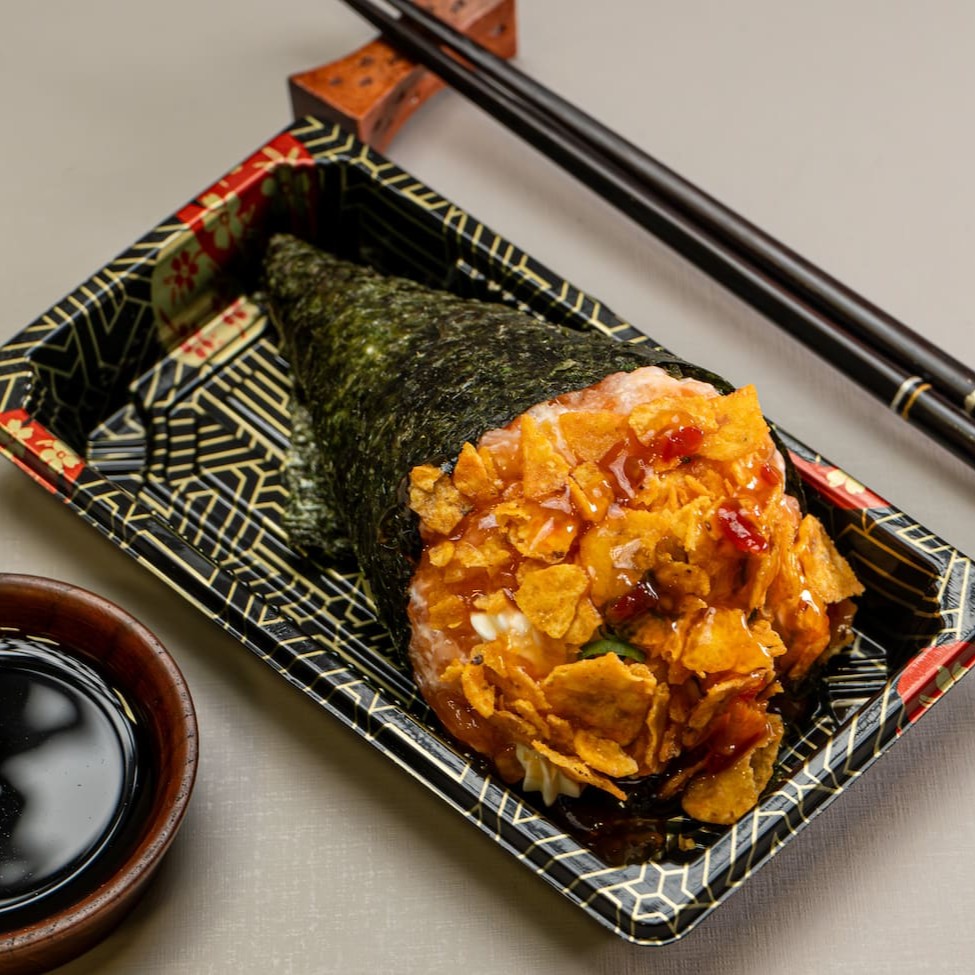 Temaki recheado com salmão (cru ou grelhado), arroz japonês, cream cheese, cebolinha e um toque do Original Doritos.