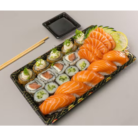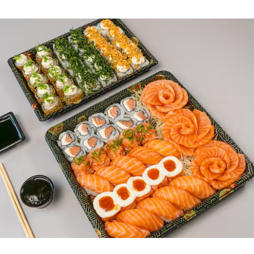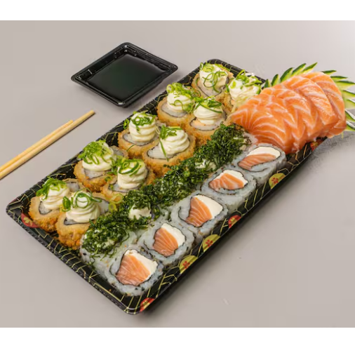 Este combo contém : 10 x Sashimi. 5 x Jow de salmão. 5 x Niguiri de salmão. 10 x Hossomaki de salmão. Entrada: 5x Guioza. 2 x Temaki (de sua preferência). Sobremesa: 10x Hot Roll Banana e Creme de Avelã.