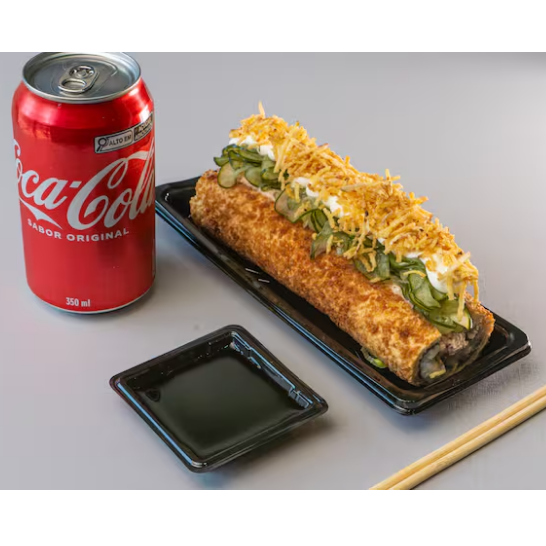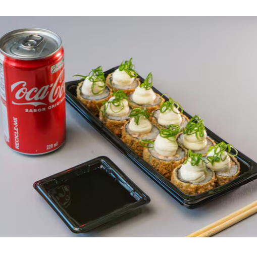 Deliciosa porção com 10 unidades de Hot Roll de Salmão acompanhada de uma Coca Cola de 220ml.