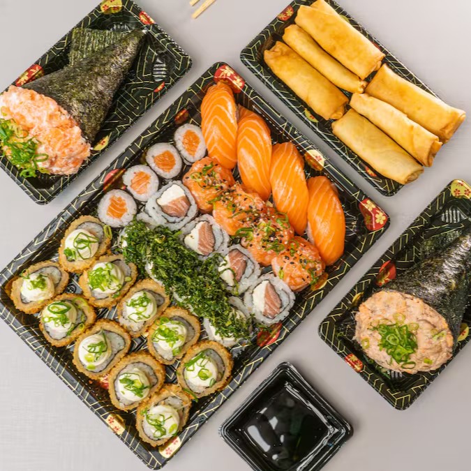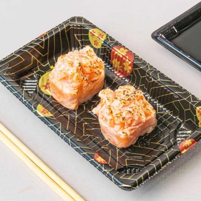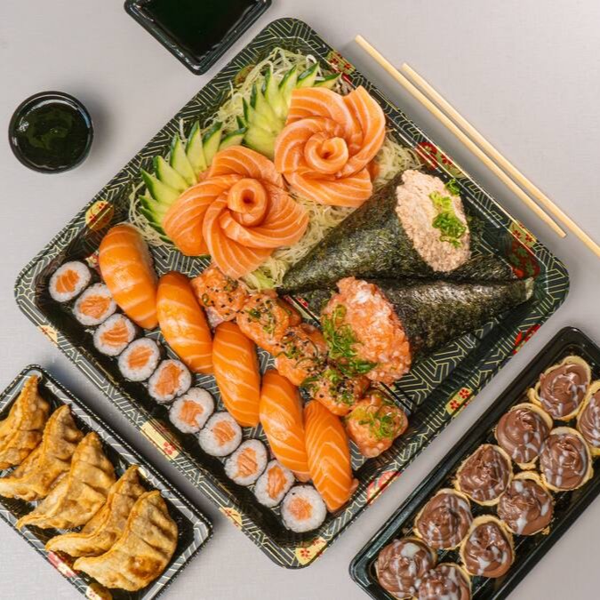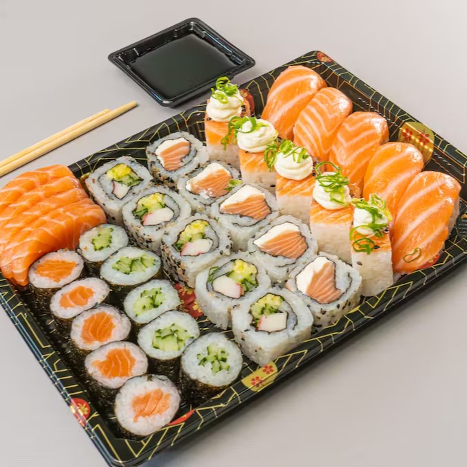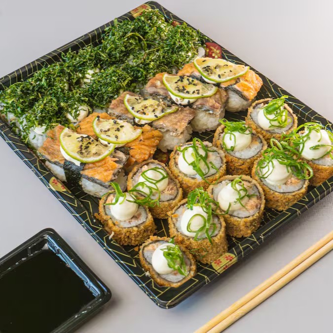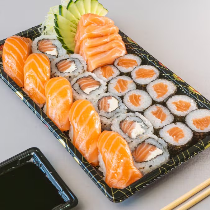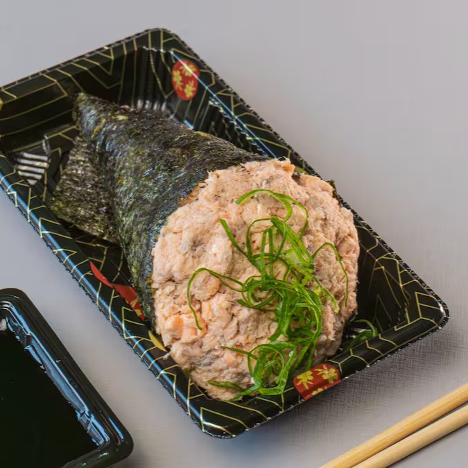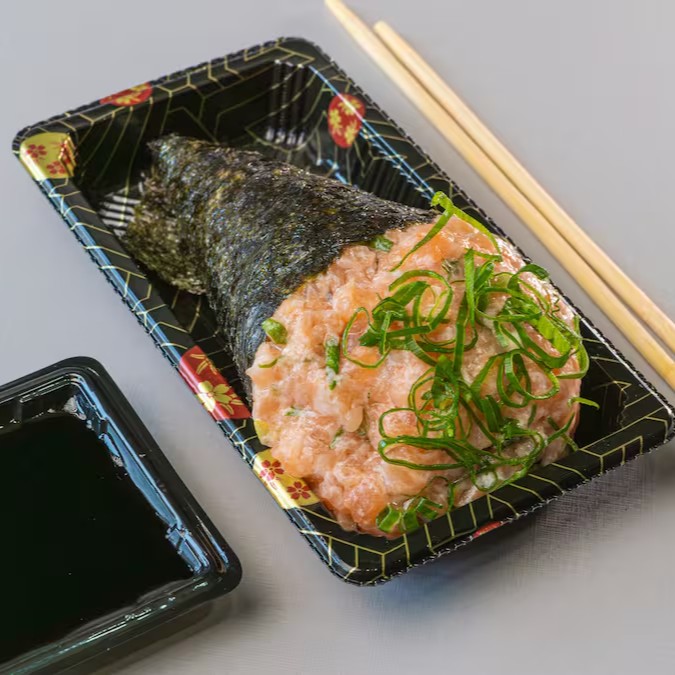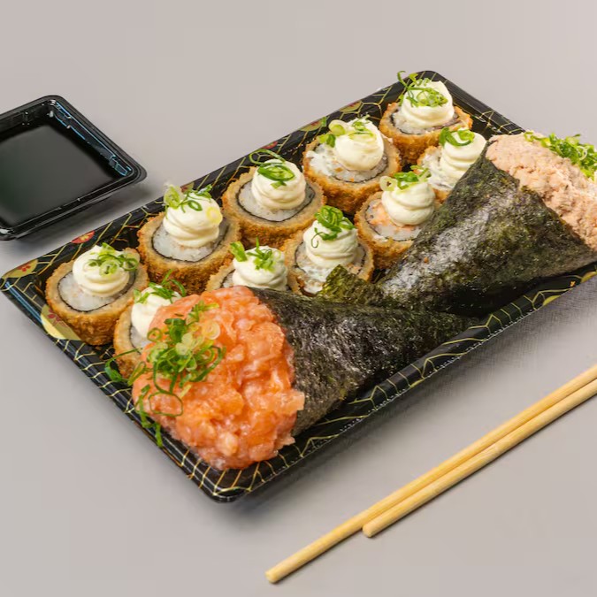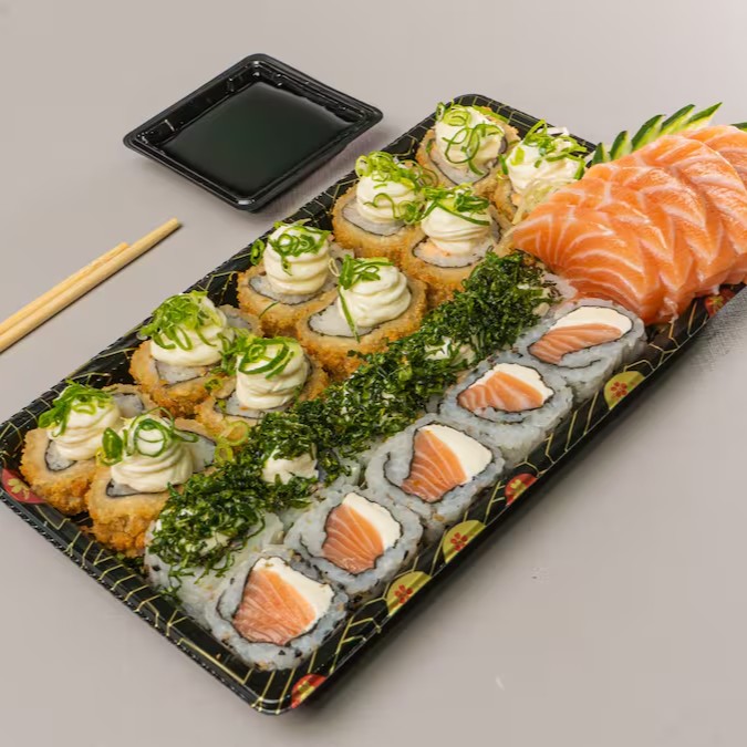 Conhecido como sushi invertido, ele traz o gohan (arroz japonês) por fora e a alga por dentro, juntamente com salmão grelhado.