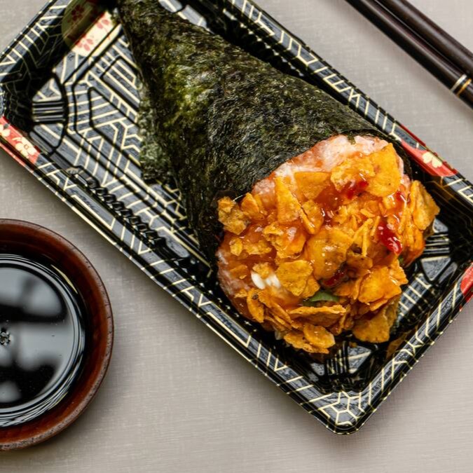 Temaki recheado com salmão (cru ou grelhado), arroz japonês, cream cheese, cebolinha e um toque do Original Doritos.