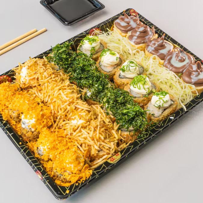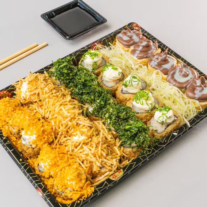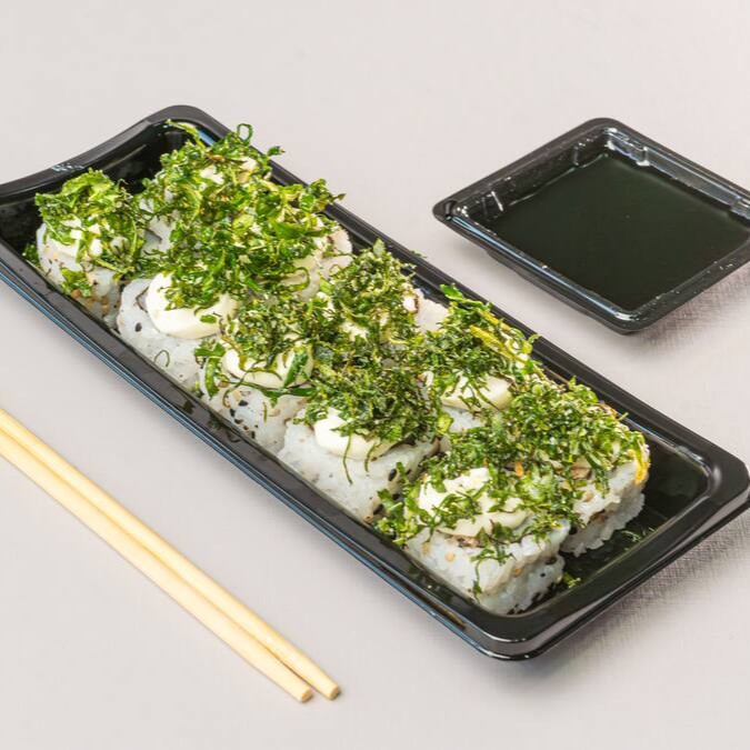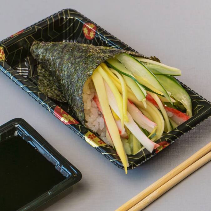 Conhecido como sushi invertido, ele traz o gohan (arroz japonês) por fora e a alga por dentro, juntamente com manga, pepino e kani.