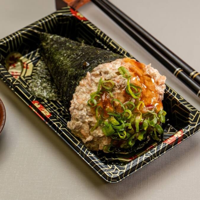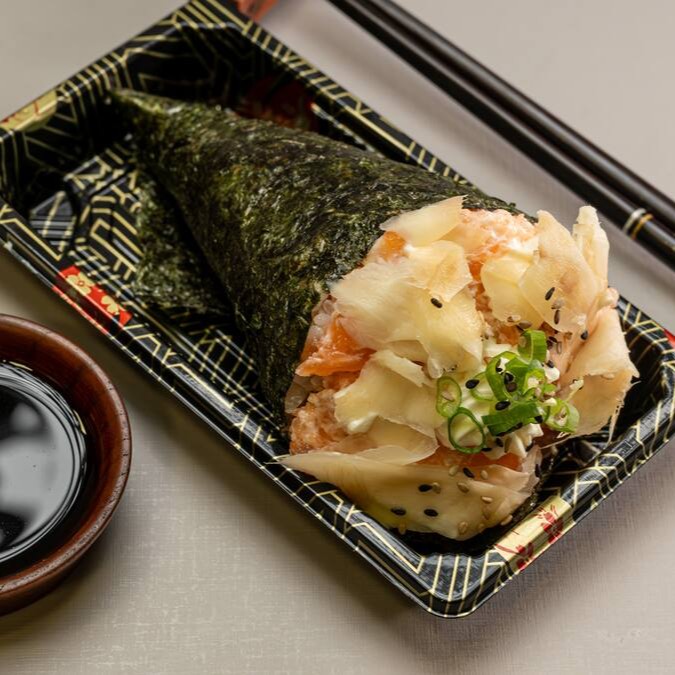 Temaki recheado com salmão (cru ou grelhado) , arroz japonês, cream cheese , cebolinha e um toque especial de gengibre.