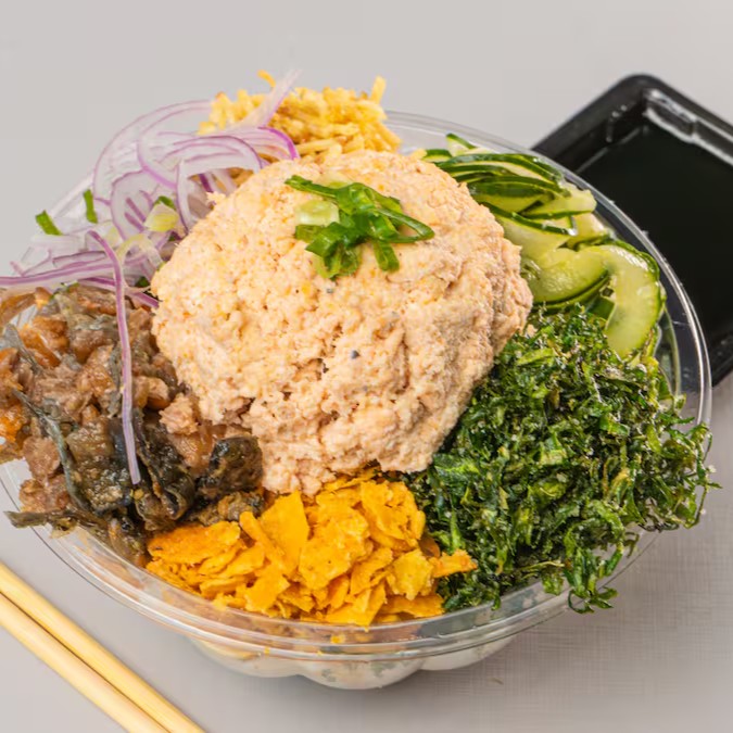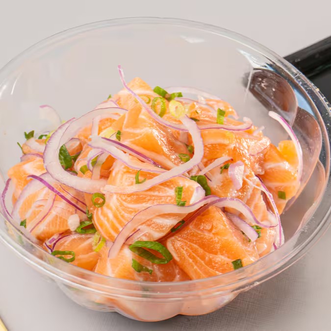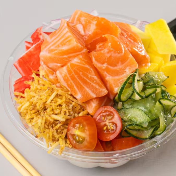 Nosso Poke de Salmão Cru é composto por salmão fresco cru, kani, tomate, manga, crispy de batata, manga, cebolinha, cebola roxa e sunomono, com base de arroz japonês e cream cheese.