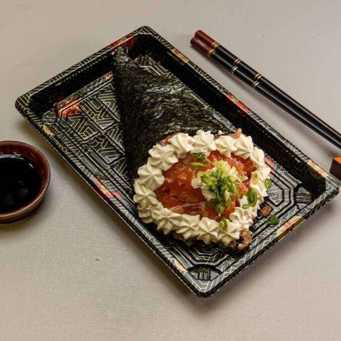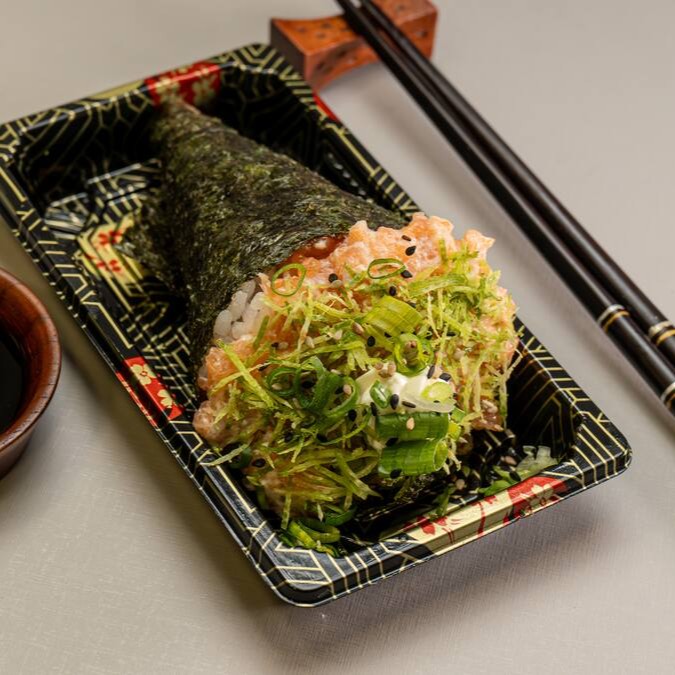 Temaki de salmão premium cru batido, com cream cheese, cebolinha e gergelim.