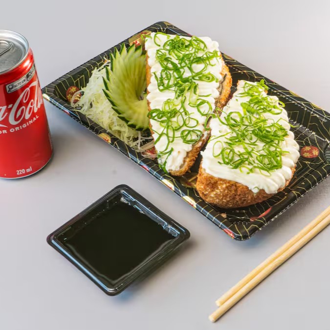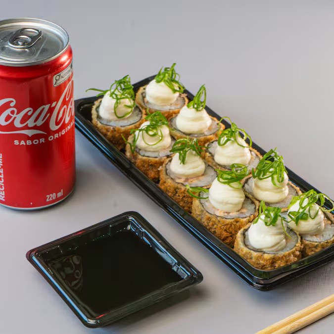 Deliciosa porção com 10 unidades de Hot Roll de Salmão acompanhada de uma Coca Cola de 220ml.