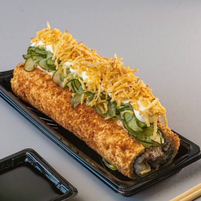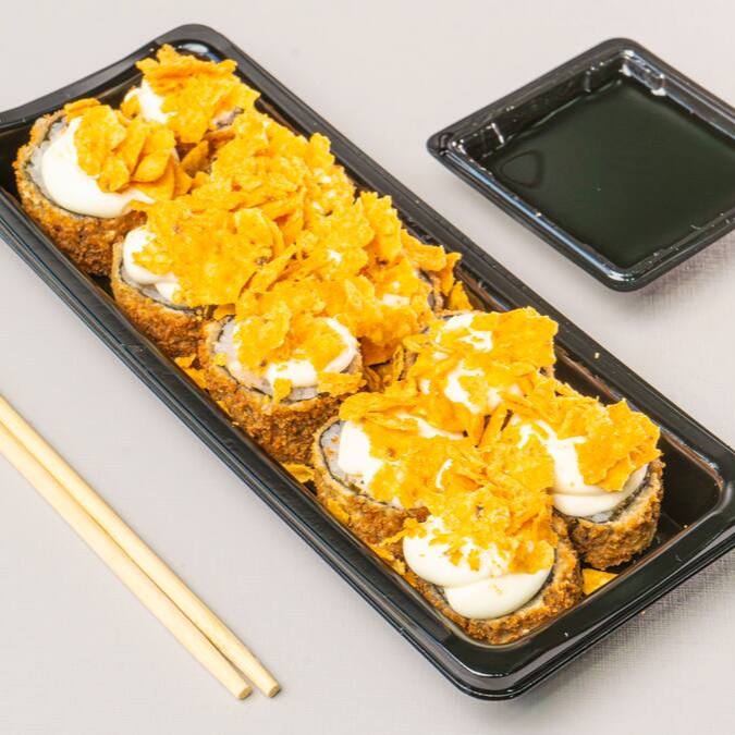 Hossomaki de salmão grelhado, empanado na farinha panko, finalizado com cream cheese e Doritos.
