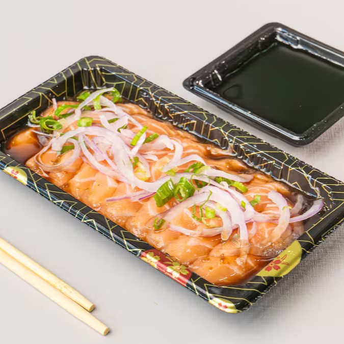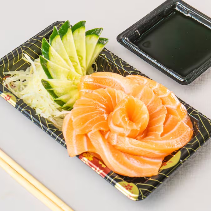 O sashimi é um dos pratos mais conhecidos da culinária japonesa. Ele é feito de pequenas fatias de salmão cru.