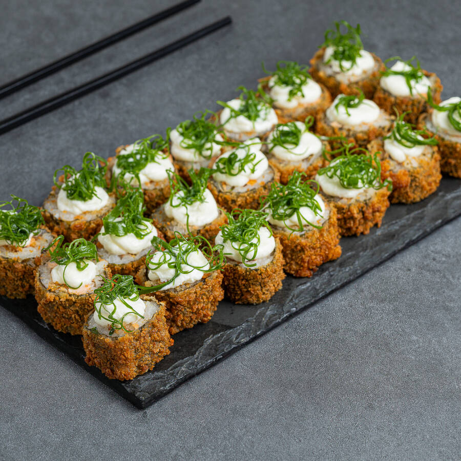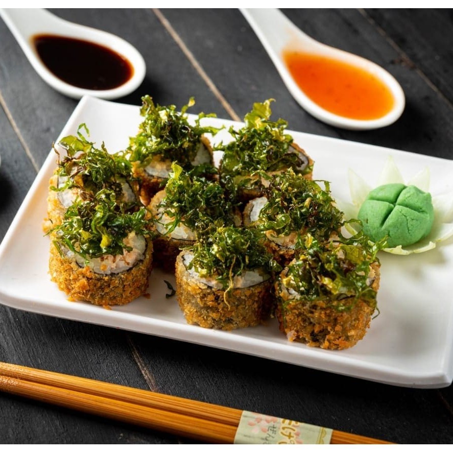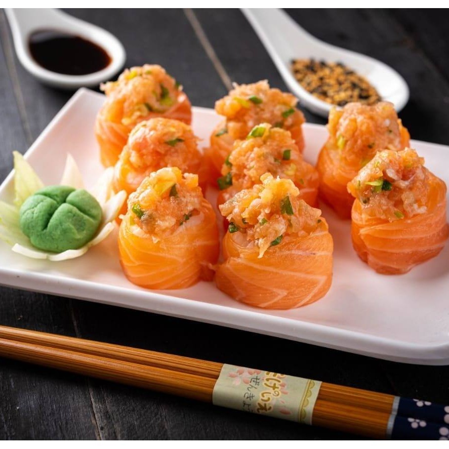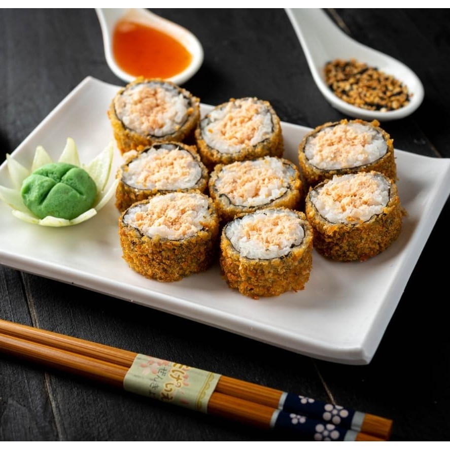 Enrolado em uma massa feita com farinha panco, recheio de salmão grelhado e molho tarê. (Acompanha somente 1 pote de shoyu 30ml e 1 par de hashi)