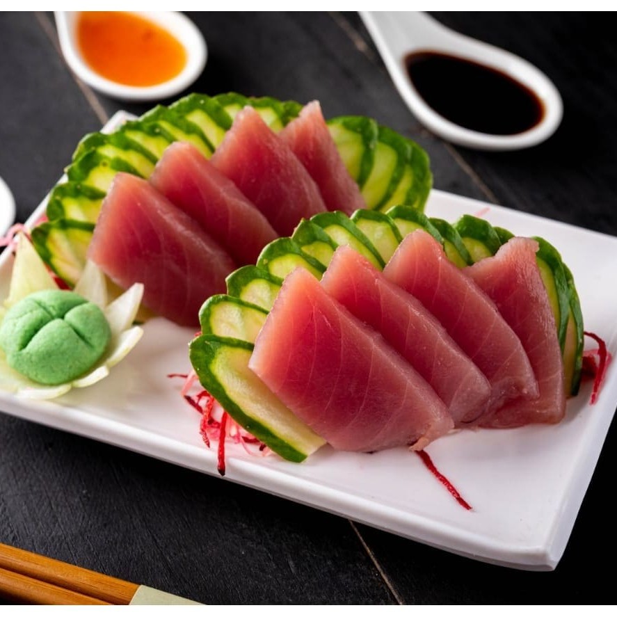 Fatias finas de atum fresquinho. (Acompanha somente 1 pote de shoyu 30ml e 1 par de hashi)