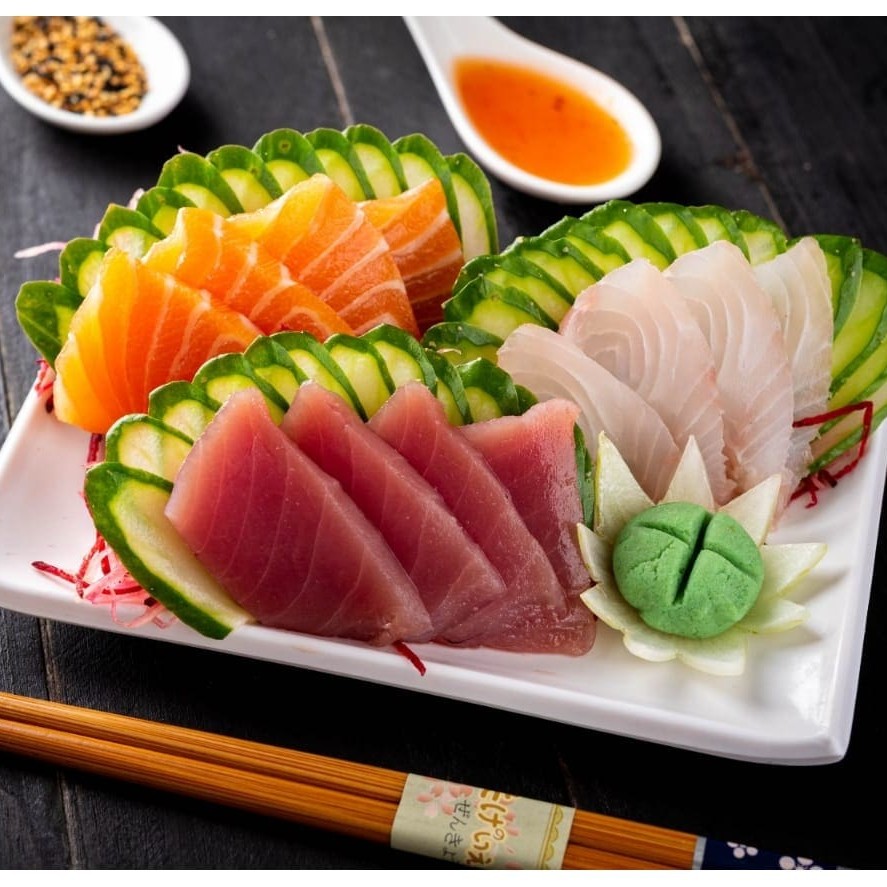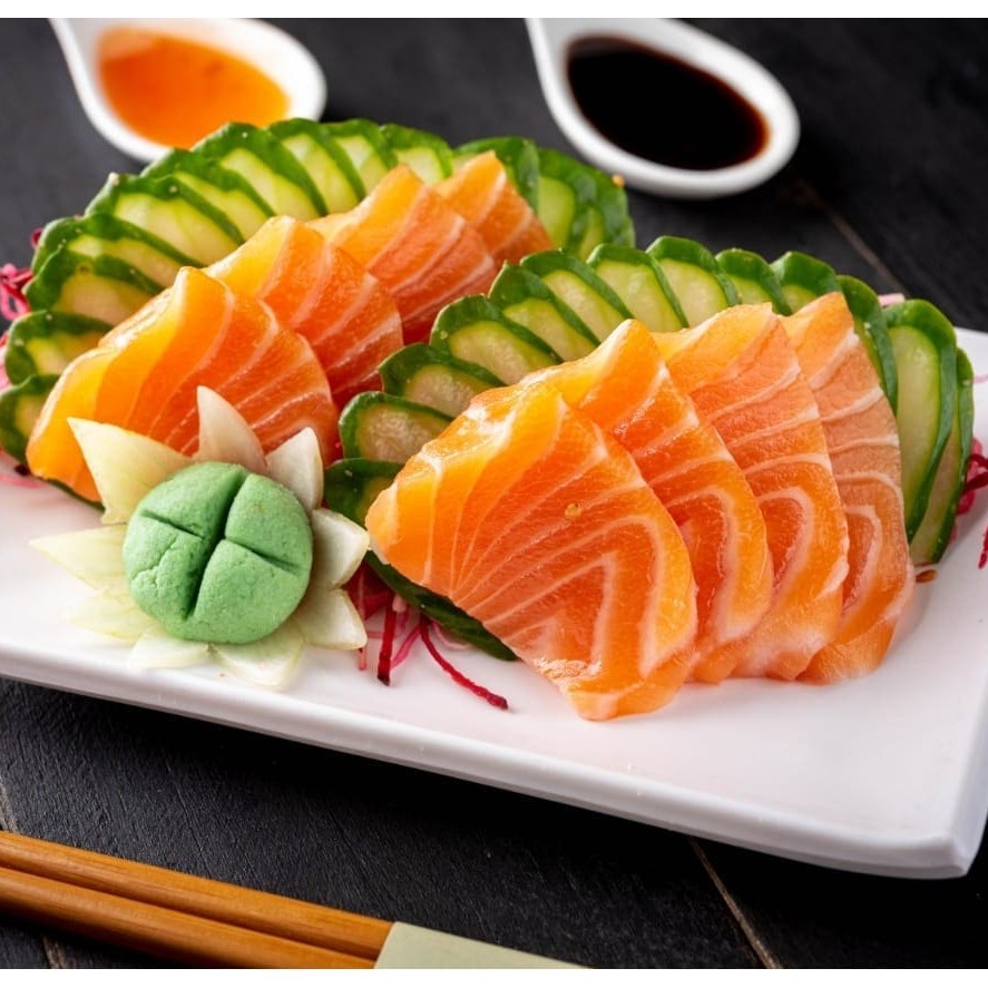 Fatias de: salmão, atum e tilapia. (Acompanha somente 1 pote de shoyu 30ml e 1 par de hashi)