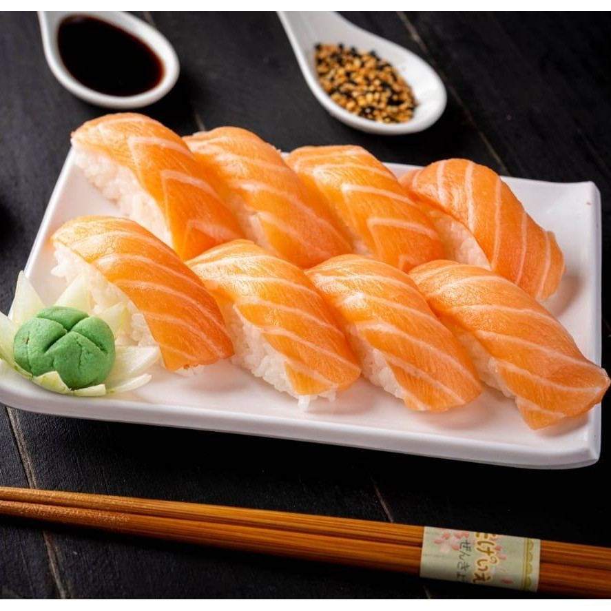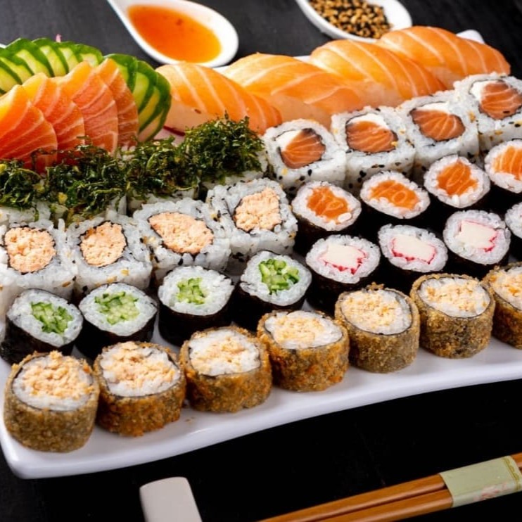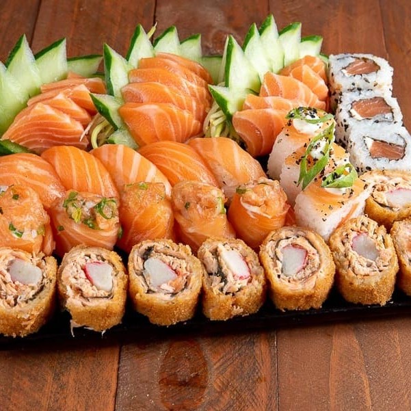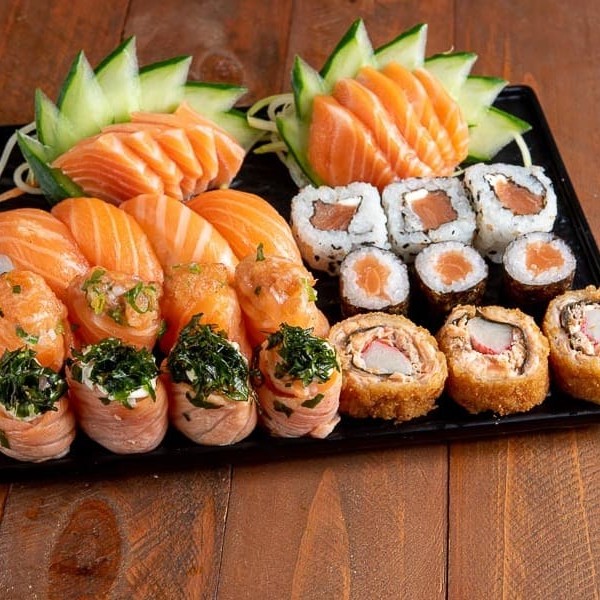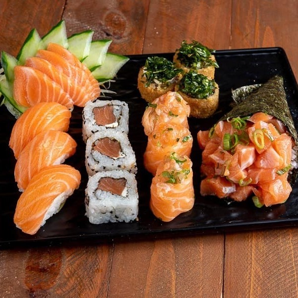 4 sashimi salmão 4 niguiri salmão 4 uramaki salmão 4 uramaki salmão grelhado 4 uramaki skin 4 kanimaki 4 shakemaki 4 kapamaki 8 hot holl (Acompanha somente 1 pote de shoyu 30ml e 1 par de hashi)