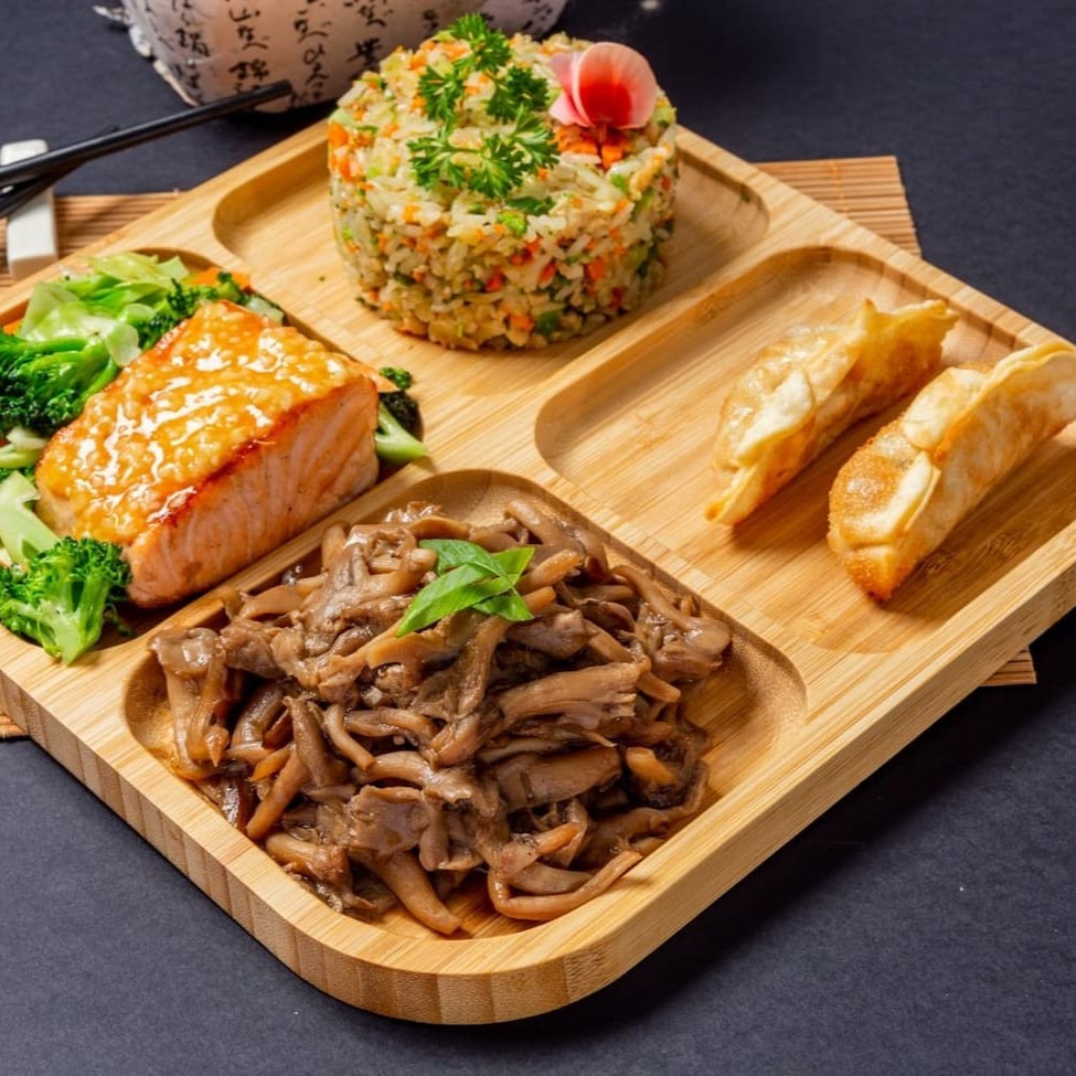 Delicioso combo, 1 Filé de Salmão grelhado 100g 1 porção de Shimeji 150g 1 porção de Yakimeshi 100g 2 Guiozas Bovina