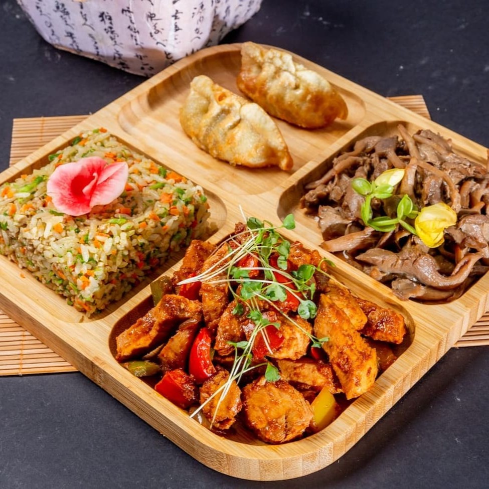 Delicioso combo, 1 porção de frango xadrez 150g 1 porção de Shimeji 150g 1 porção de Yakimeshi 100g 2 Guiozas Bovina
