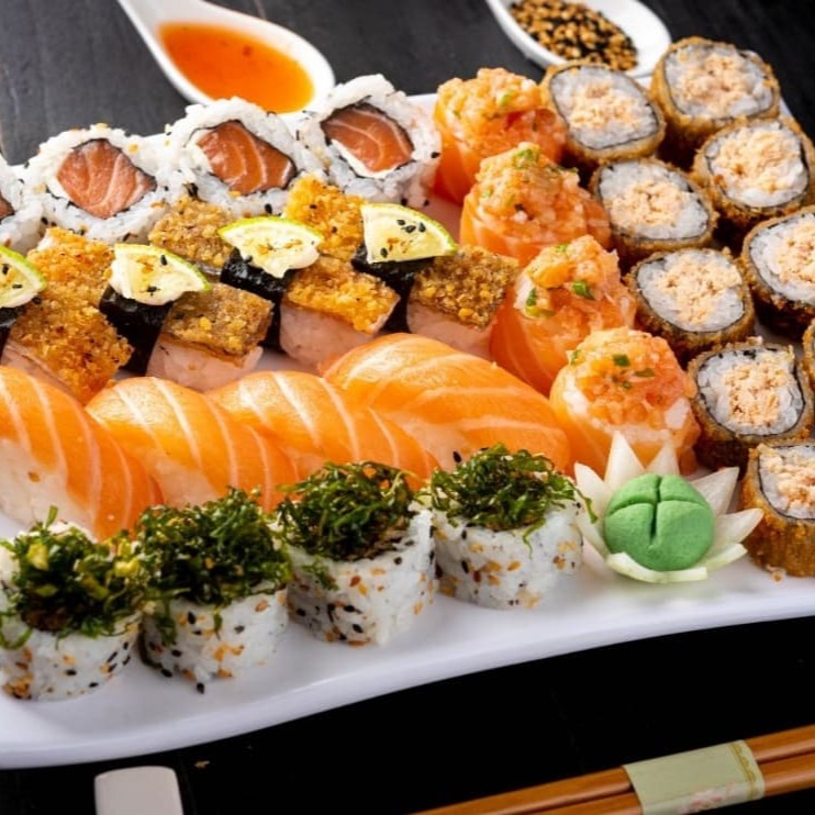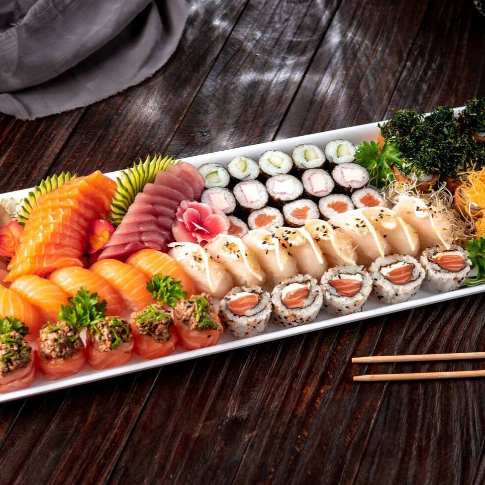 4 sashimi salmão, 4 sashimi tilápia, 4 niguiri salmão, 4 jou salmão, 4 uramaki salmão, 4 uaramai skin, 4 shakemaki, 4 niguiri skin, 6 hot roll. 2 salmão grelhados, 1 shimeji (300 g), 4 harumaki (queijo), 4 guioza (carne). (Acompanha somente 1 pote de shoyu 30ml e 1 par de hashi)