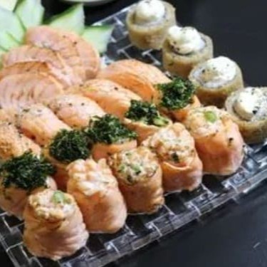 5 uramaki salmão grelhado 5 uramaki skin 5 niguiri skin 5 nigiri salmao massaricado 10 hot holl (Acompanha somente 1 pote de shoyu 30ml e 1 par de hashi)