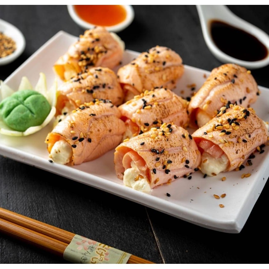 Enrolado de salmão maçaricado, recheio de cream cheese com gergelim.