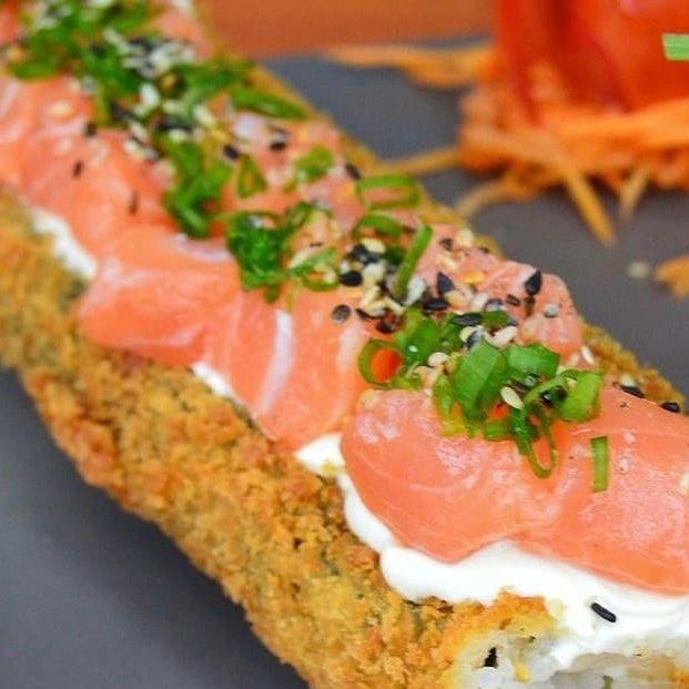 Hot empanado com recheio de cream cheese, cortado ao meio e coberto por salmão super fresco misturado no cream cheese e finalizar com cebolinha