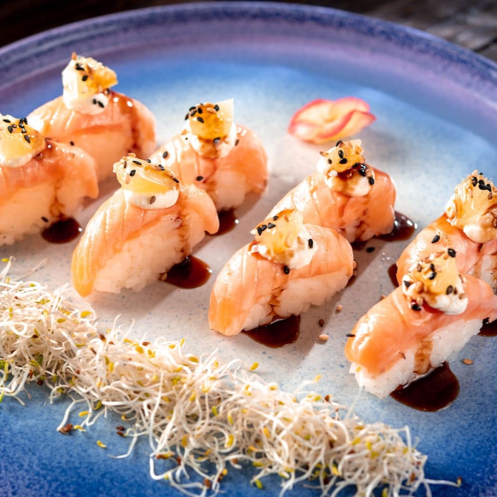 Niguiri de salmão recheado com cream cheese, laranja e gergelim. (Acompanha somente 1 pote de shoyu 30ml, 1 sachê de tarê e 1 par de hashi)