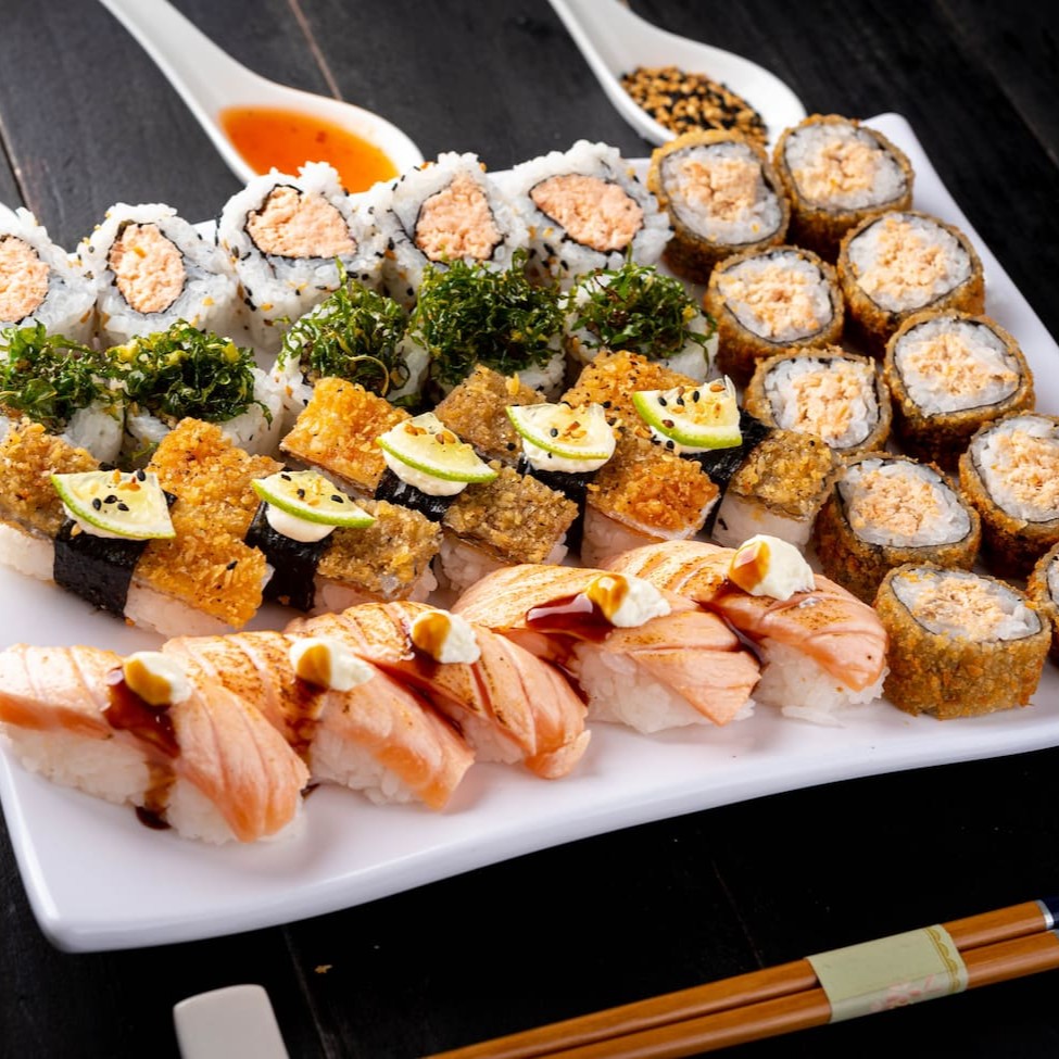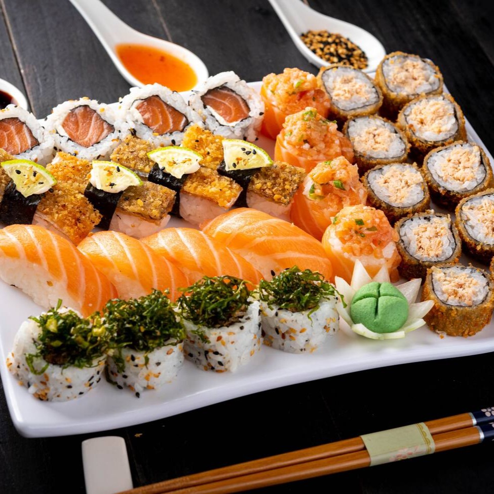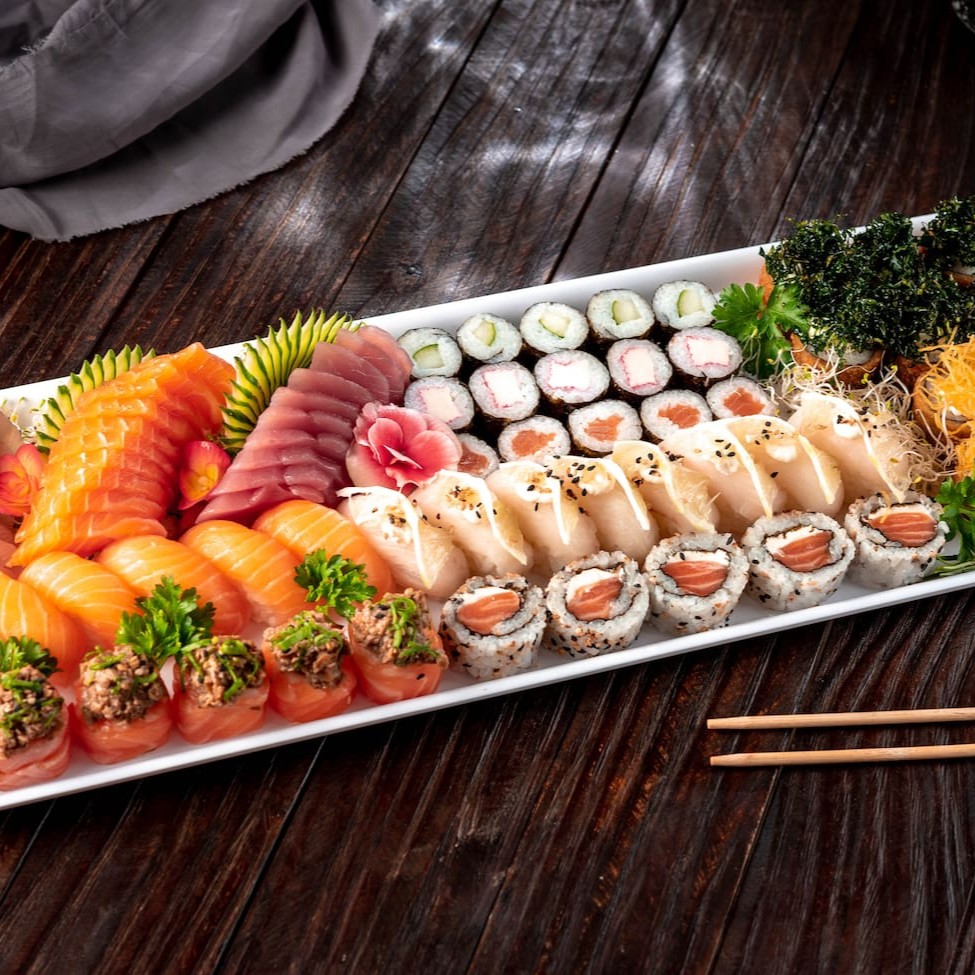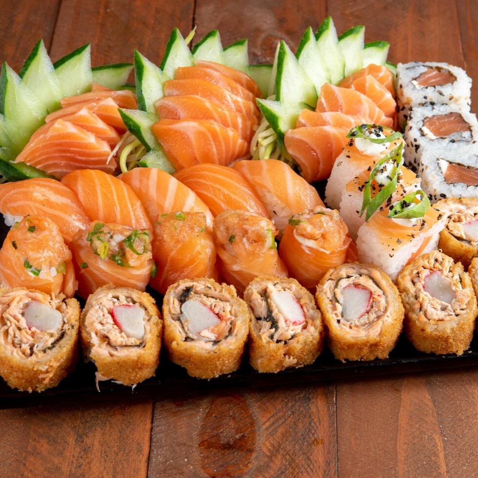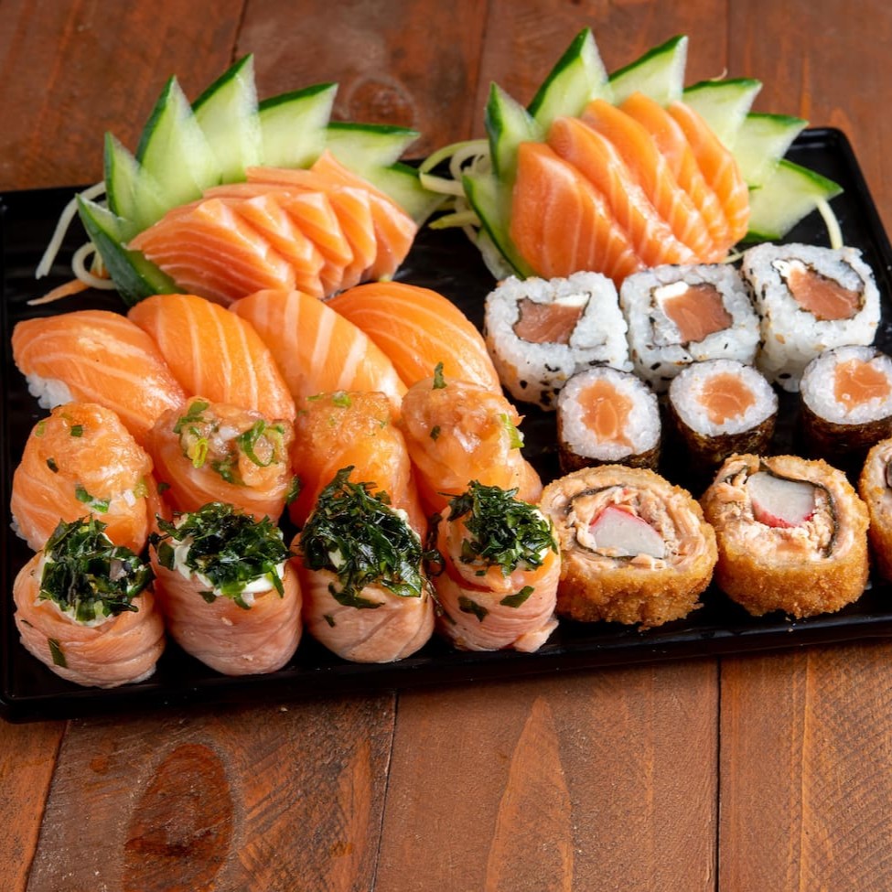 8 sashimi salmão 8 niguiri salmão 8 uramaki salmão 8 uramaki salmão grelhado 8 uramaki skin 8 kanimaki 8 shakemaki 8 kapamaki 16 hot holl (Acompanha somente 1 pote de shoyu 30ml e 1 par de hashi)