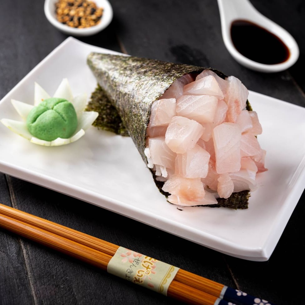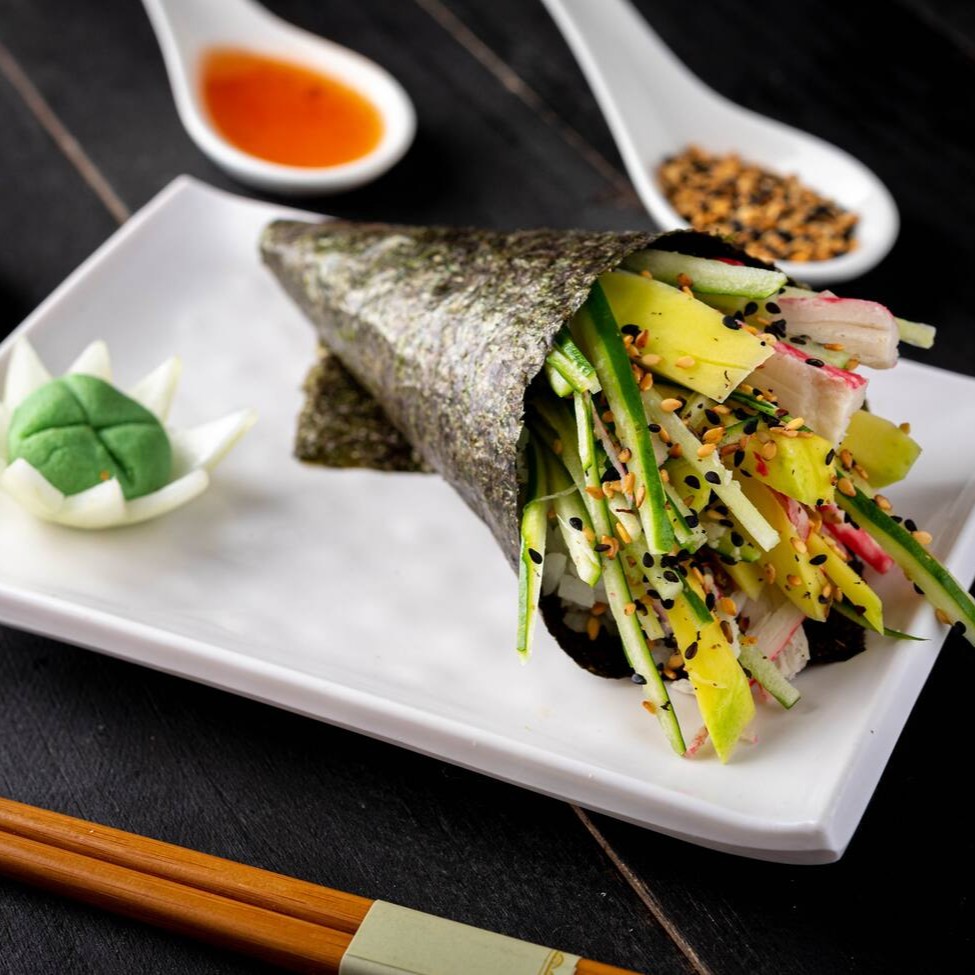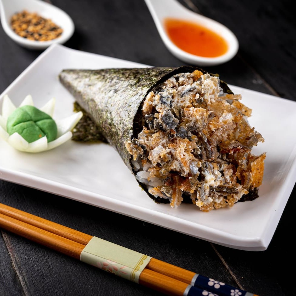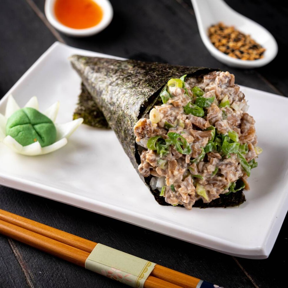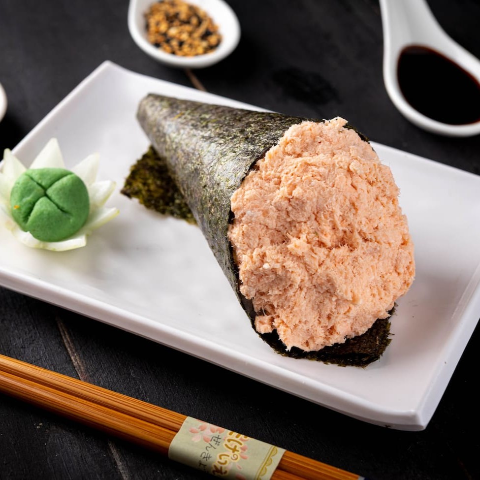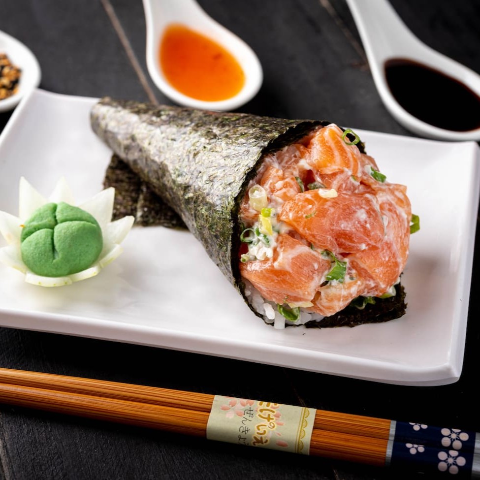 Enrolado de nori em formato de cone, com salmão e arroz. (acompanha shoyu e haishi)