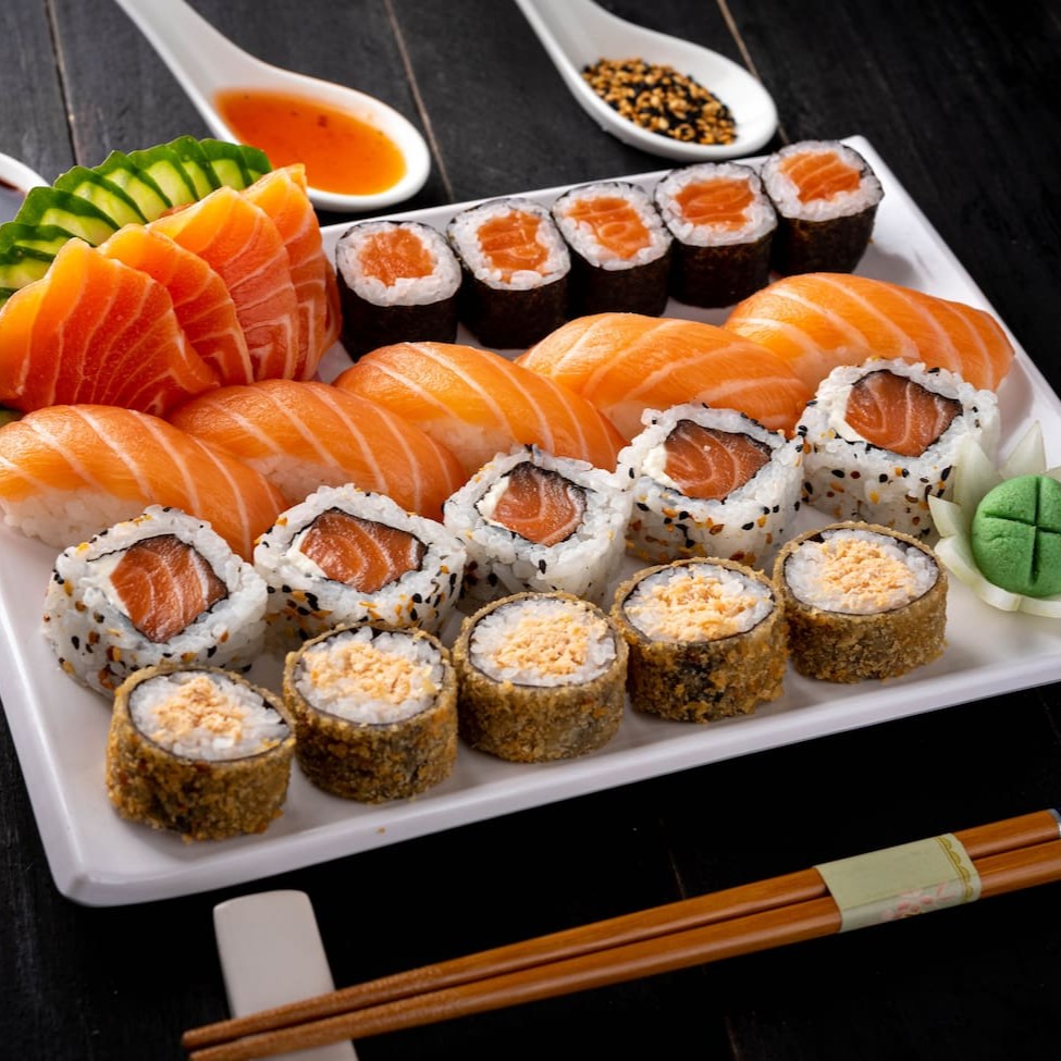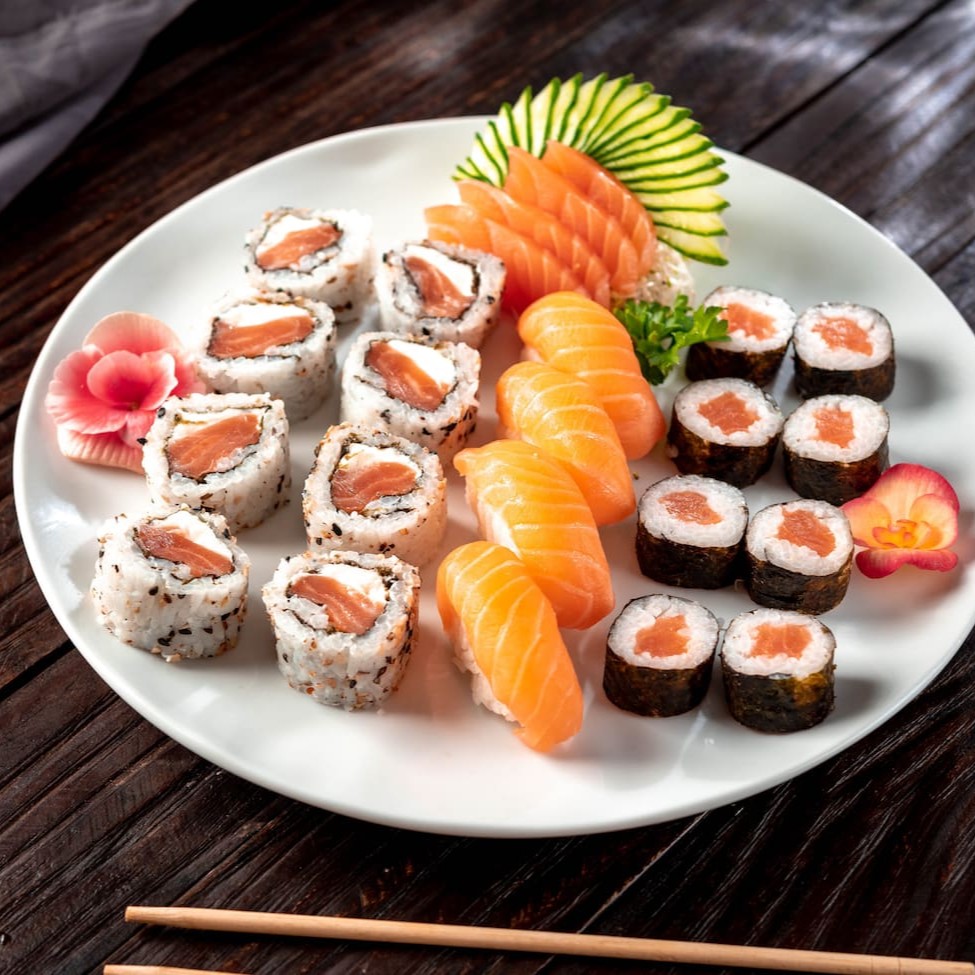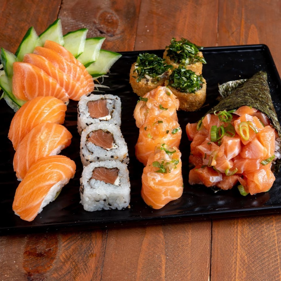 4 sashimi salmão 4 niguiri salmão 4 uramaki salmão 4 uramaki salmão grelhado 4 uramaki skin 4 kanimaki 4 shakemaki 4 kapamaki 8 hot holl (Acompanha somente 1 pote de shoyu 30ml e 1 par de hashi)