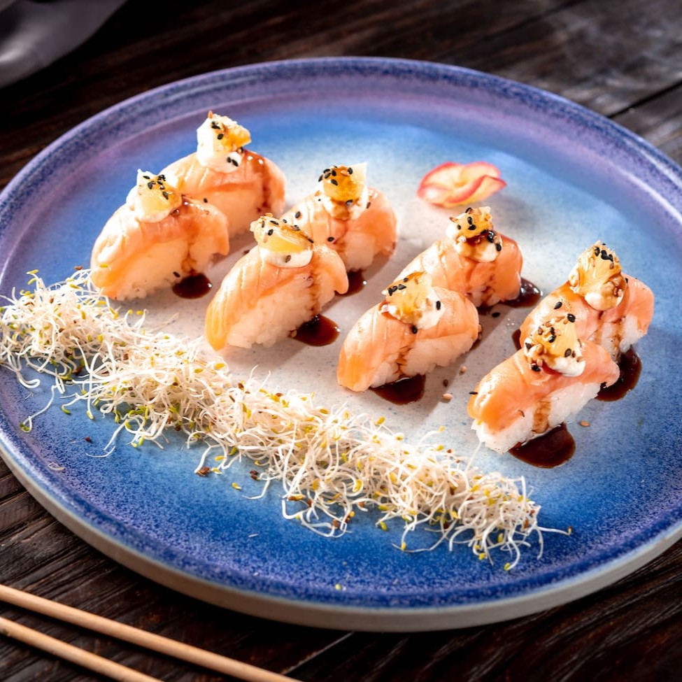 Niguiri de salmão recheado com cream cheese, laranja e gergelim. (Acompanha somente 1 pote de shoyu 30ml, 1 sachê de tarê e 1 par de hashi)