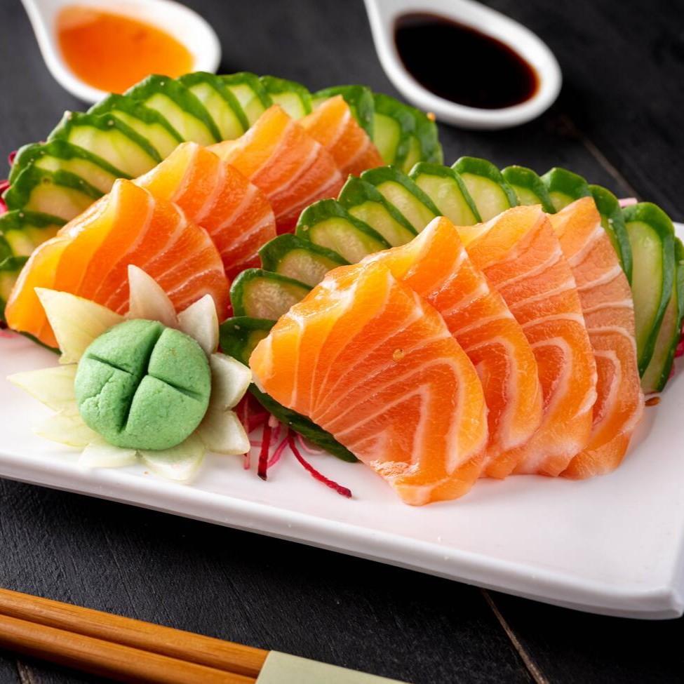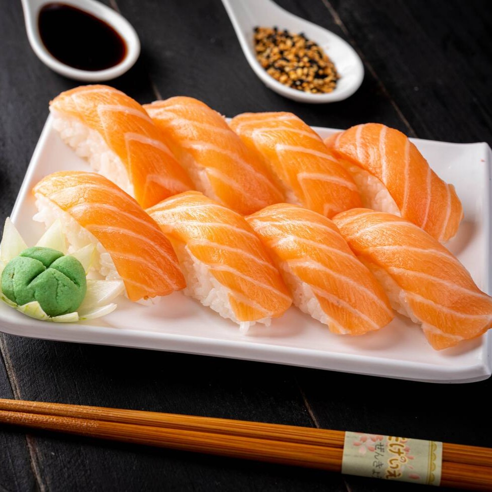 Fatias finas de salmão fresquinho. (Acompanha somente 1 pote de shoyu 30ml e 1 par de hashi)