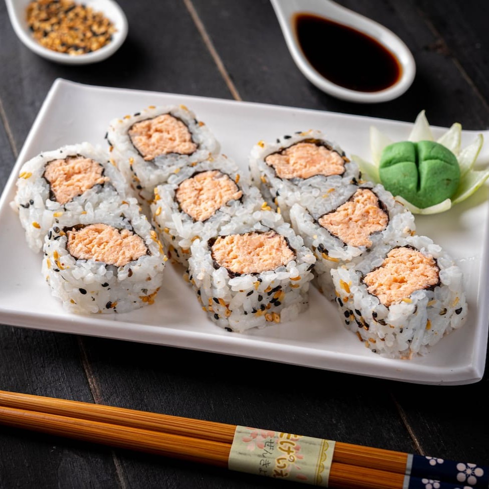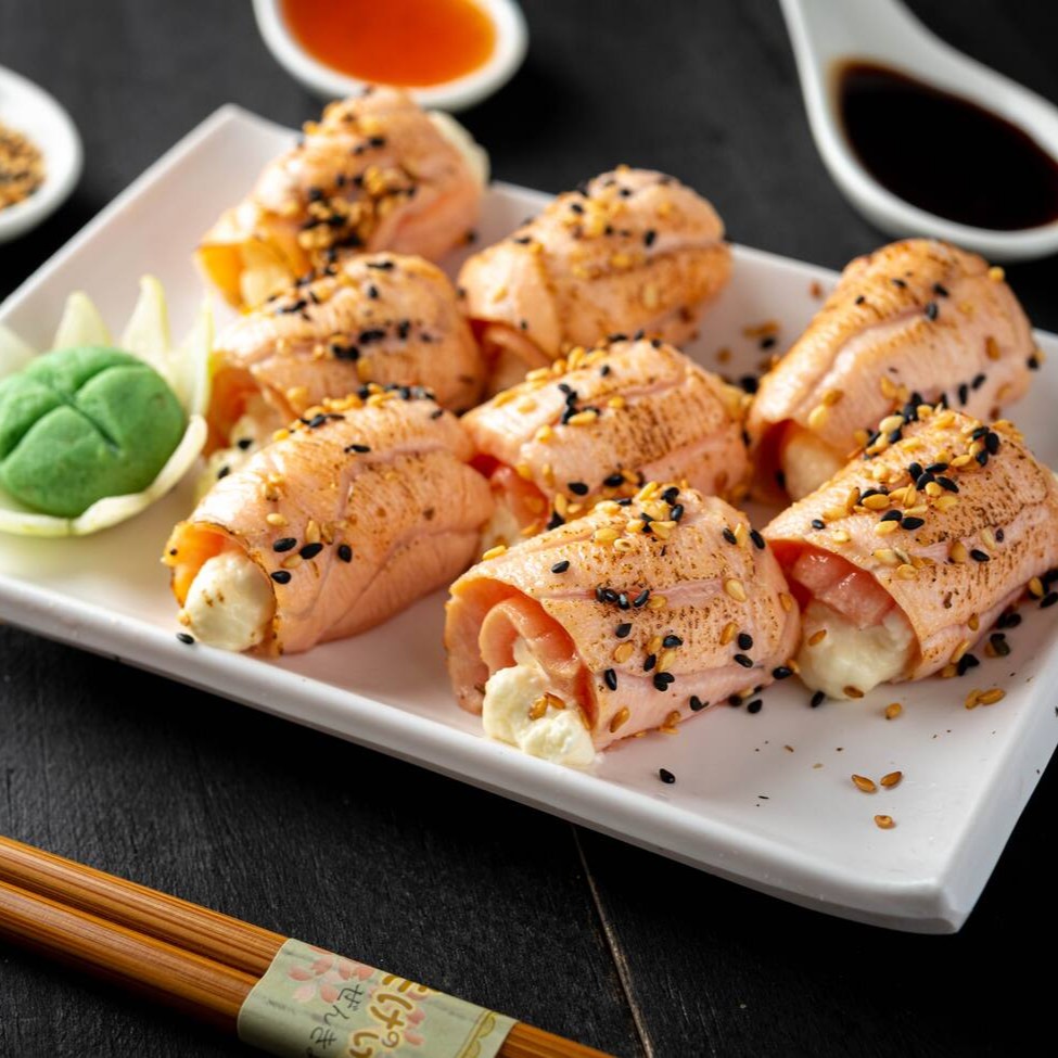 Enrolado de salmão maçaricado, recheio de cream cheese com gergelim e molho tarê. (Acompanha somente 1 pote de shoyu 30ml e 1 par de hashi)