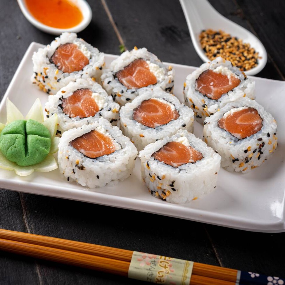 Enrolado de arroz e gergilim, recheado com salmão e cream cheese. (Acompanha somente 1 pote de shoyu 30ml e 1 par de hashi)