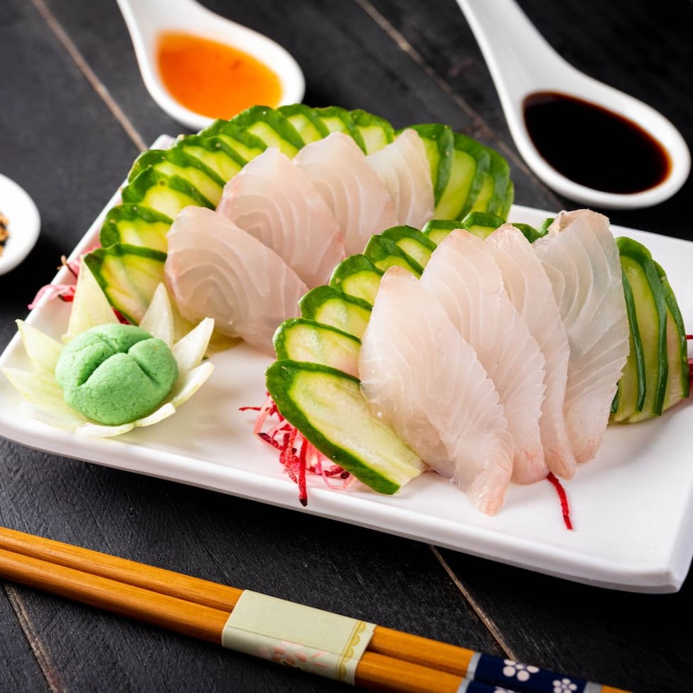 Fatias finas de tilápia fresquinha. (Acompanha somente 1 pote de shoyu 30ml e 1 par de hashi)