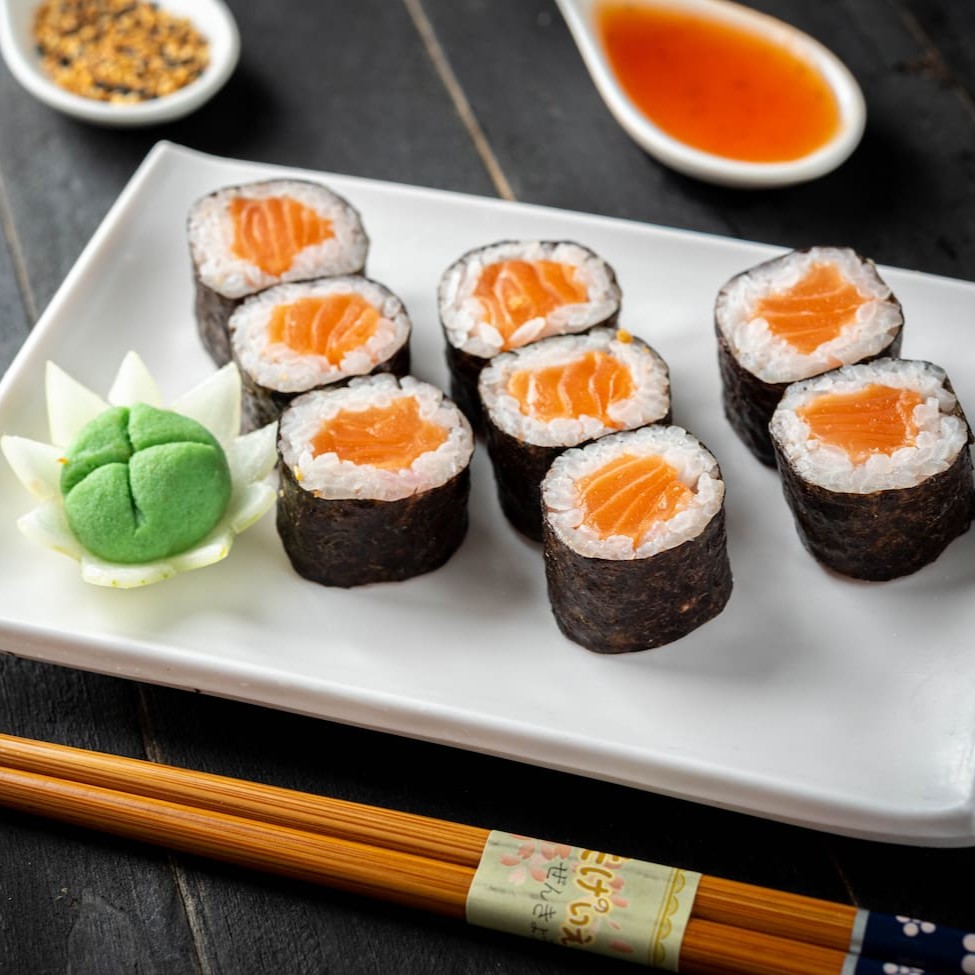 Enrolado em folha de alha marinha, recheio de arroz e salmão. (Acompanha somente 1 pote de shoyu 30ml e 1 par de hashi)