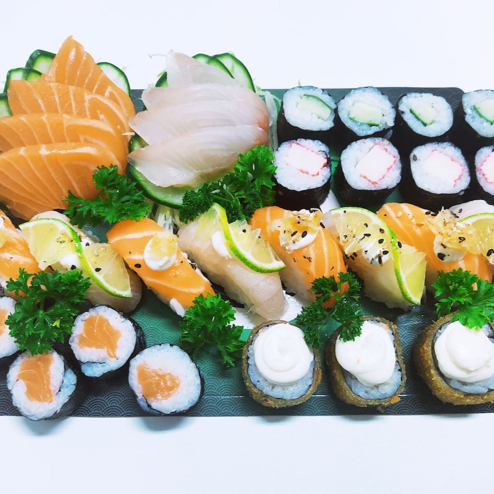 4 sashimi salmão 4 sashimi tilápia 4 nigiri salmão 4 nigiri tilápia 4 salmão maki 4 kapa maki 4 kani maki 3 hot holl (acompanha 1 pote shoyue 1 par de hashi)