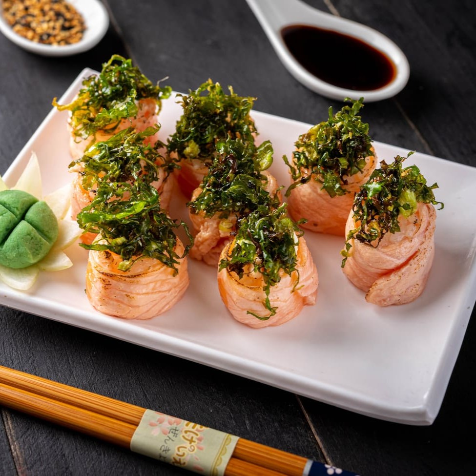 Enrolado de salmão maçaricado e arroz, recheio de cream cheese, couve frito e molho tarê. (Acompanha somente 1 pote de shoyu 30ml e 1 par de hashi)