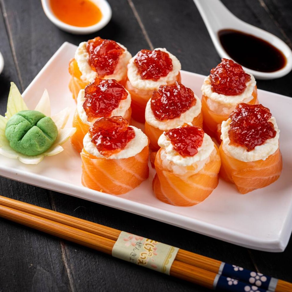 Enrolado de salmão maçaricado, recheio de cream cheese com gergelim e molho tarê. (Acompanha somente 1 pote de shoyu 30ml e 1 par de hashi)