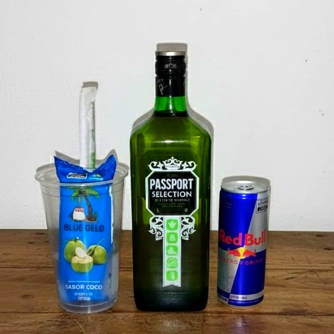Acompanha 150 ml de Passport 1 gelo de coco 1 Redbull 250 ml copo 700 ml e canudo